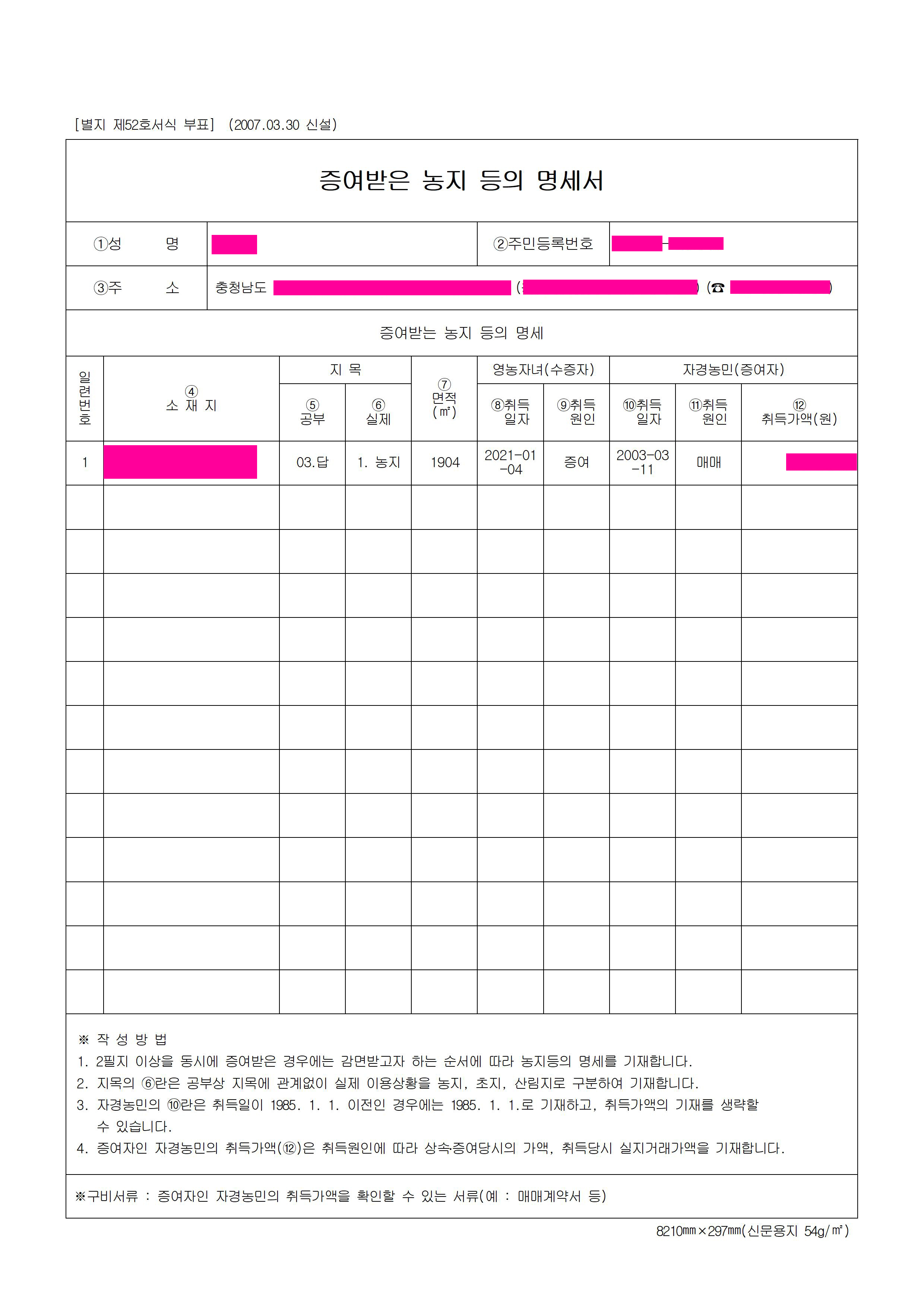 4. 증여받은 농지등의 명세서(2007.02.28 신설)