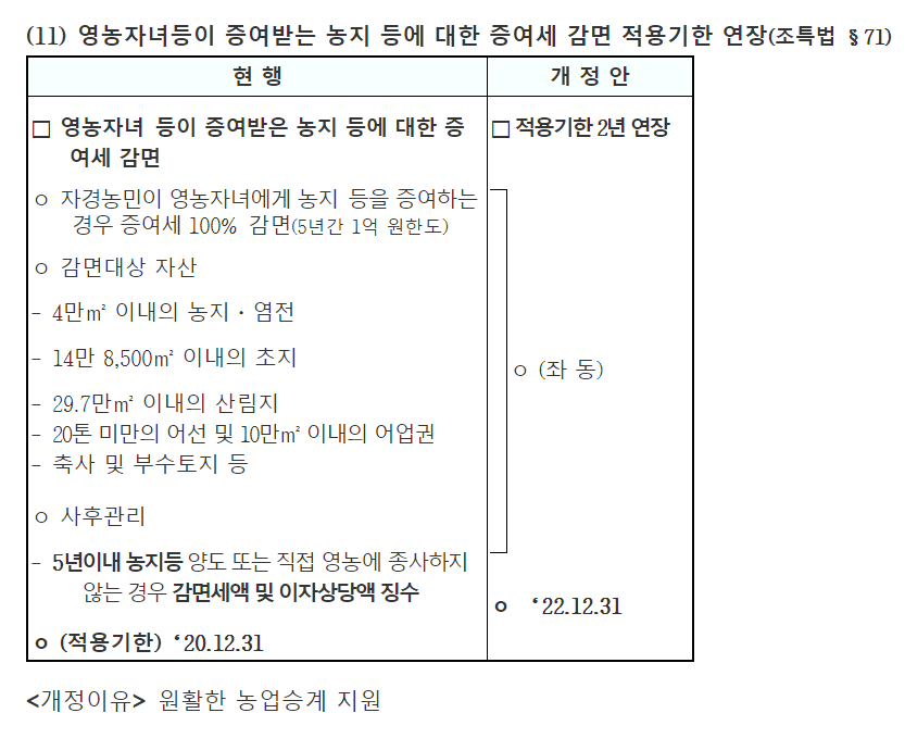 | 2. 영농자녀 증여세 과세특례 대상 재산 확대 (조세특례제한법 제71조) |