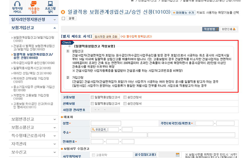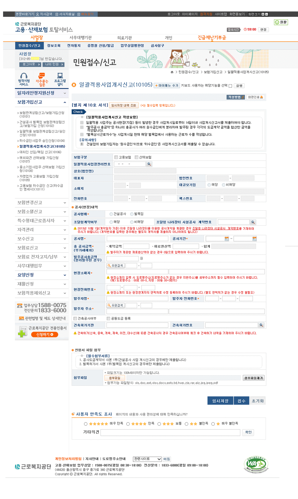 신고(신청)인 제출서류 | 공사도급계약서 사본, 건설업면허 사본 각 1부(일괄적용 성립신고의 경우에만 해당합니다) | 수수료