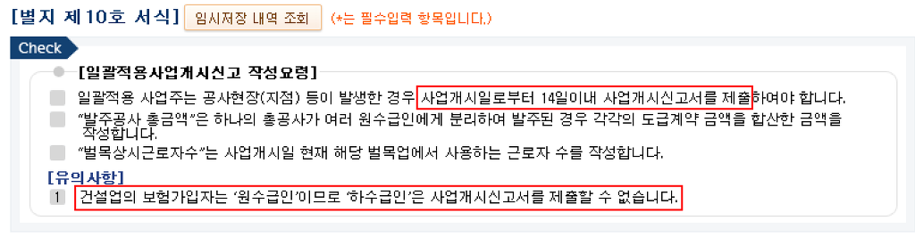 2.일괄적용 사업주는 그 각각의 사업에 대한 사업 개시신고서를 사업개시일부터 14일 이내에 산재보험의 경우 공사현장 또는 지점ㆍ지사ㆍ공장 관할 지역본부(지사)에 제출하고, 고용보험의 경우 주된 사업장 관할 지역본부(지사)에 제출해야 합니다.