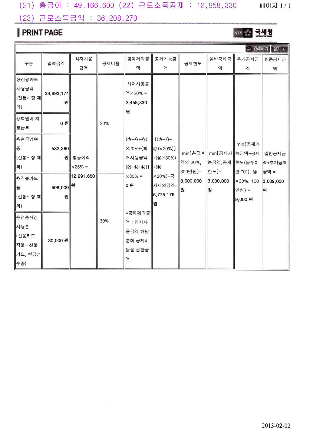 ㆍ최저사용금액(총급여액의 25%)>신용카드사용분: 신용카드사용분× 20% + (최저사용 금액-신용카드사용분)× 30%