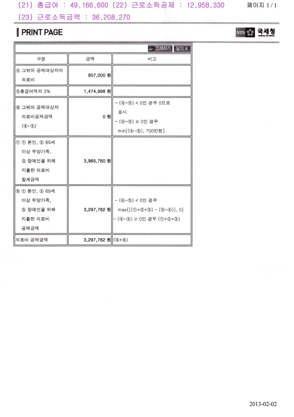 공제 금액 (①+②+③)+(④-의료비 공제문턱) (①+②+③)-(의료비 공제문턱-④)