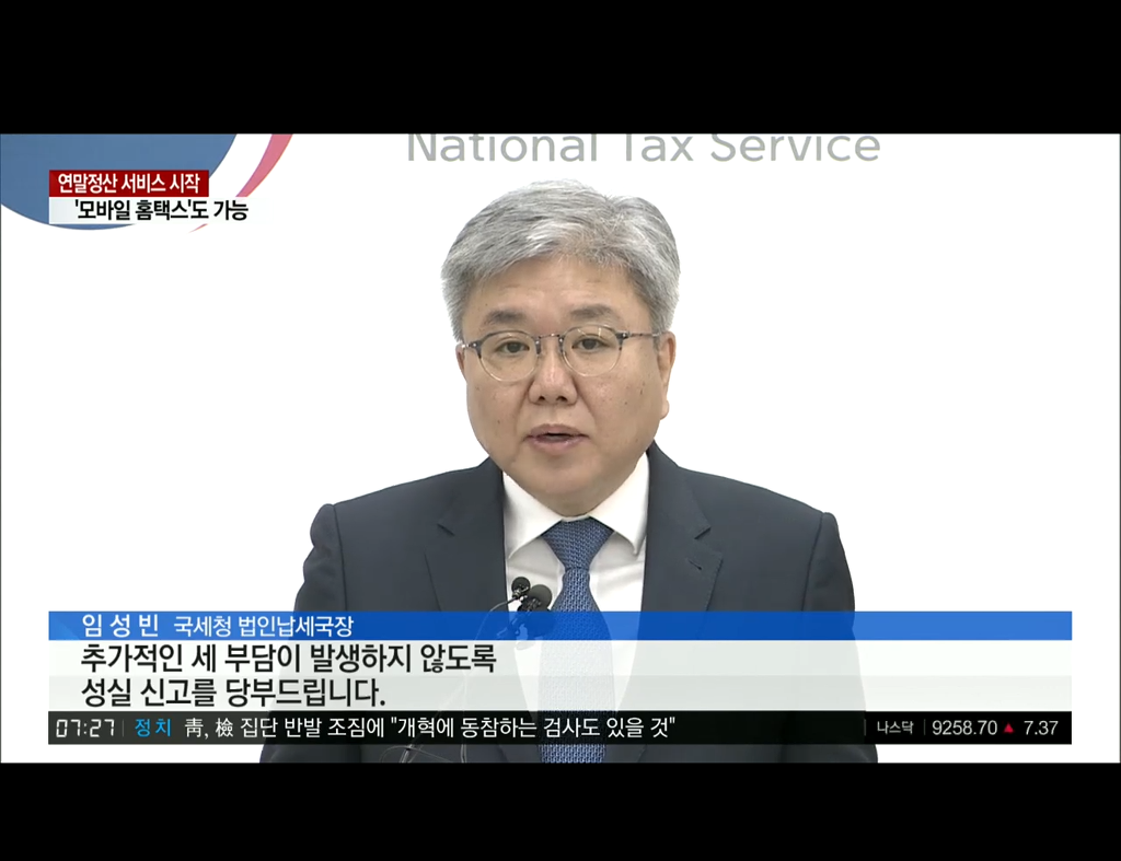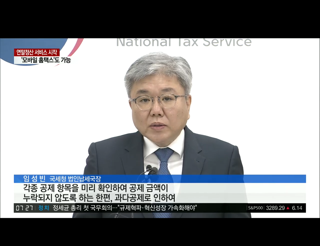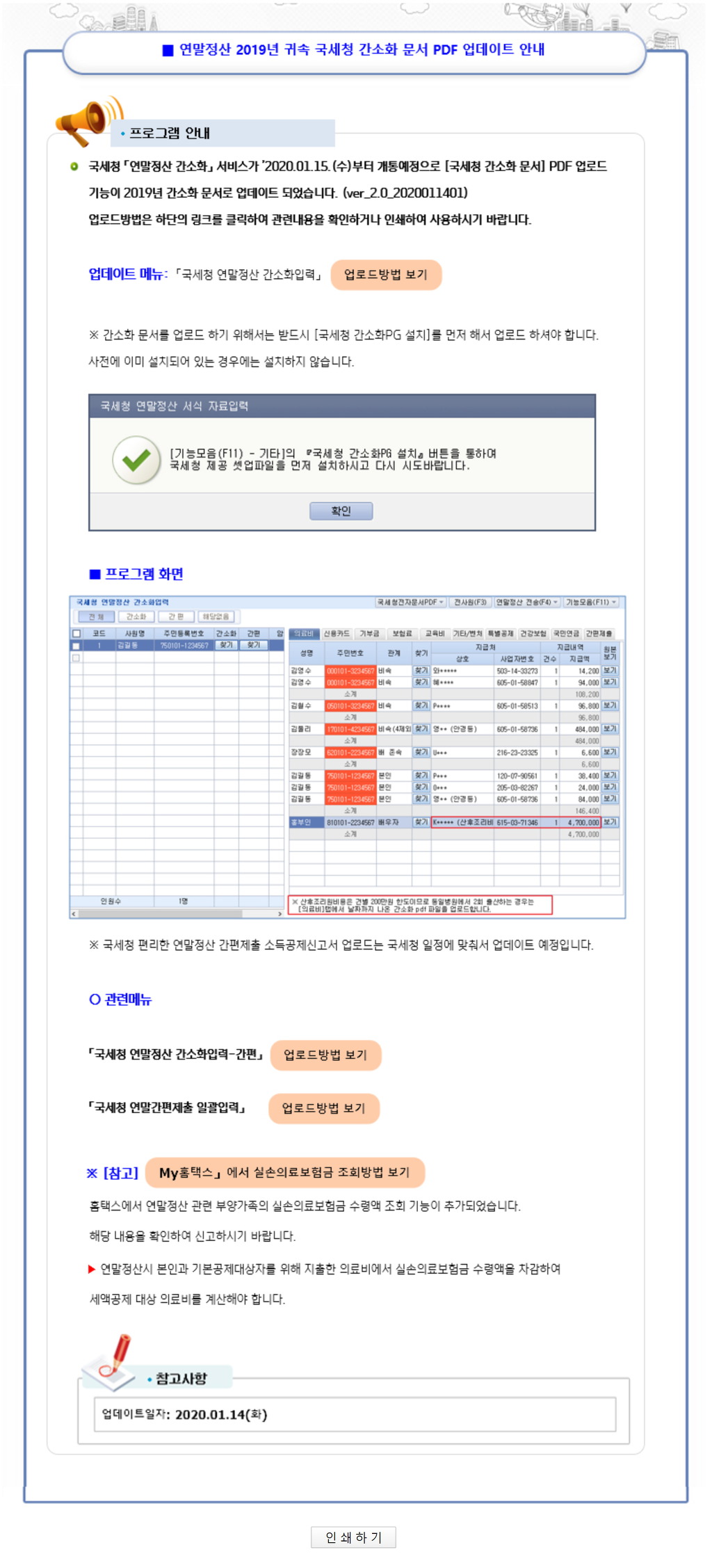 연말정산 2019년 귀속 국세청 간소화 문서 PDF 업데이트 안내 작성자Jayden Ju.|작성시간20.01.14|조회수195 목록 댓글 0 글자크기 작게가 글자크기 크게가 http://link.neo-plus.com/link/new_message/html/SW_upmsg_2020/2020011401/html_20200114_ShowPopup.htm급여 소득에서 원천 징수한 소득세에 대하여, 연말에 그 과부족을 정산하는 일신고 · 납부기한2020.03.10(화)연말정산 간소화 서비스2020.01.15(수) 오픈주요정보국세청 연말정산 안내, 국세청 홈택스관련정보공식블로그, 유튜브, 연말정산 종합안내, 연말정산 미리보기 안내, 연말정산 도움말 자료꼭! 필요한 서류신고서식 및 첨부서류문의국세청 세미래 콜센터 (전화상담 국번없이 126) 다음검색 현재 게시글 추가 기능 열기 북마크 공유하기 신고 센터로 신고 댓글 댓글 0 댓글쓰기 답글쓰기 댓글 리스트