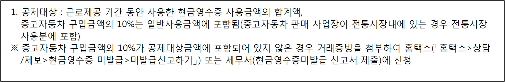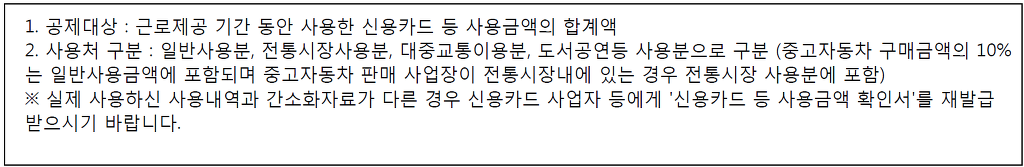 ※ 중고자동차 구입금액은 구입금액의 10%가 소득공제 대상에 추가되며, 중고자동차 구입금액의 10%를 일반사용금액에 포함하여 제공합니다. (중고자동차판매 사업장이 전통시장내에 있는 경우 전통시장 사용분에 포함하여 제공함)