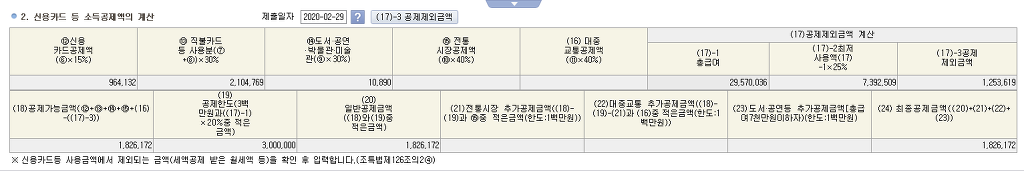: 신용카드사용분 X 15% + (최저사용금액 – 신용카드사용분) X 30%-신용카드 + 현금영수증 + 직불·선불카드 + 총급여 7천만원 이하자의 도서·공연 등 사용분 < 최저사용금액(총급여액의 25%) 인 경우
