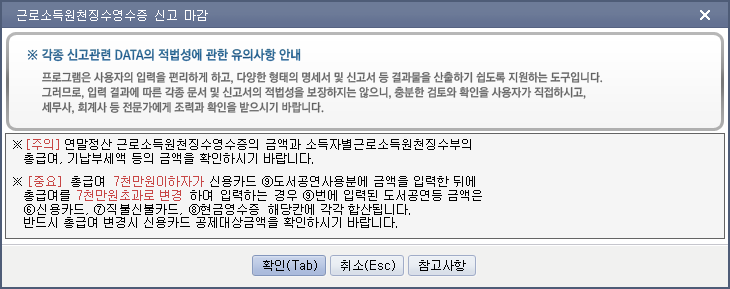 신용카드 소득공제 | ○ 기본공제대상자인 형제자매의 신용카드 등 사용금액을 제외하였는지 확인 ○ 연간소득금액이 100만원(근로소득만 있는 자는 총급여 500만원)을 초과한 배우자 등의 신용카드 등 사용금액을 제외하였는지 확인 |
