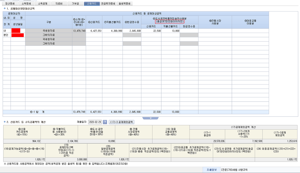 신용카드 등 소득공제 금액:①+②+③+④+⑤-⑥