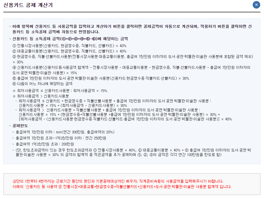 : 신용카드사용분 X 15% + (현금영수증 + 직불·선불카드 + 총급여 7천만원 이하자의 도서·공연 등 사용분) X 30% + (최저사용금액 – 신용카드사용분 – 현금영수증 - 직불·선불카드 – 총급여 7천만원 이하자의 도서·공연 등 사용분) X 40%
