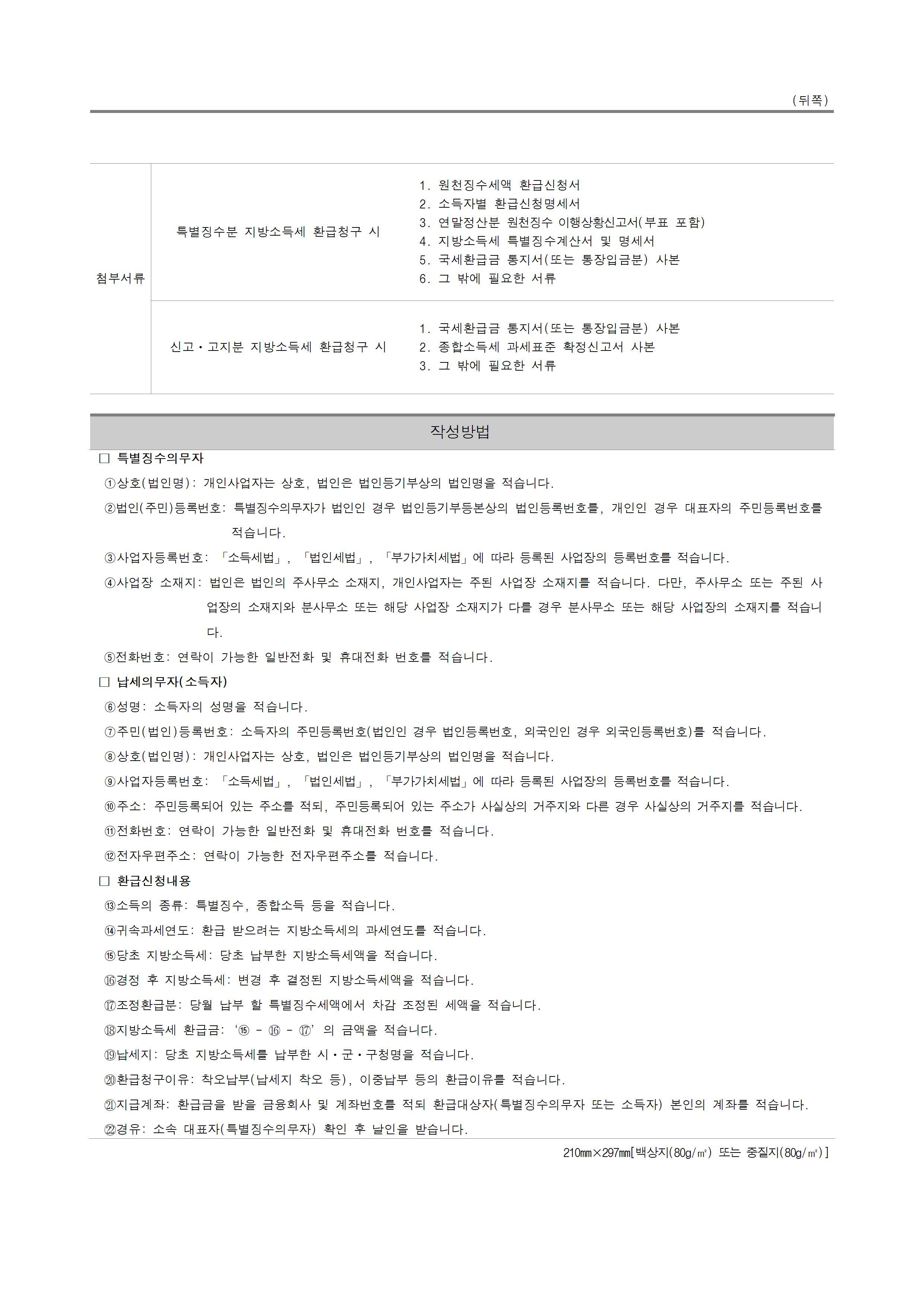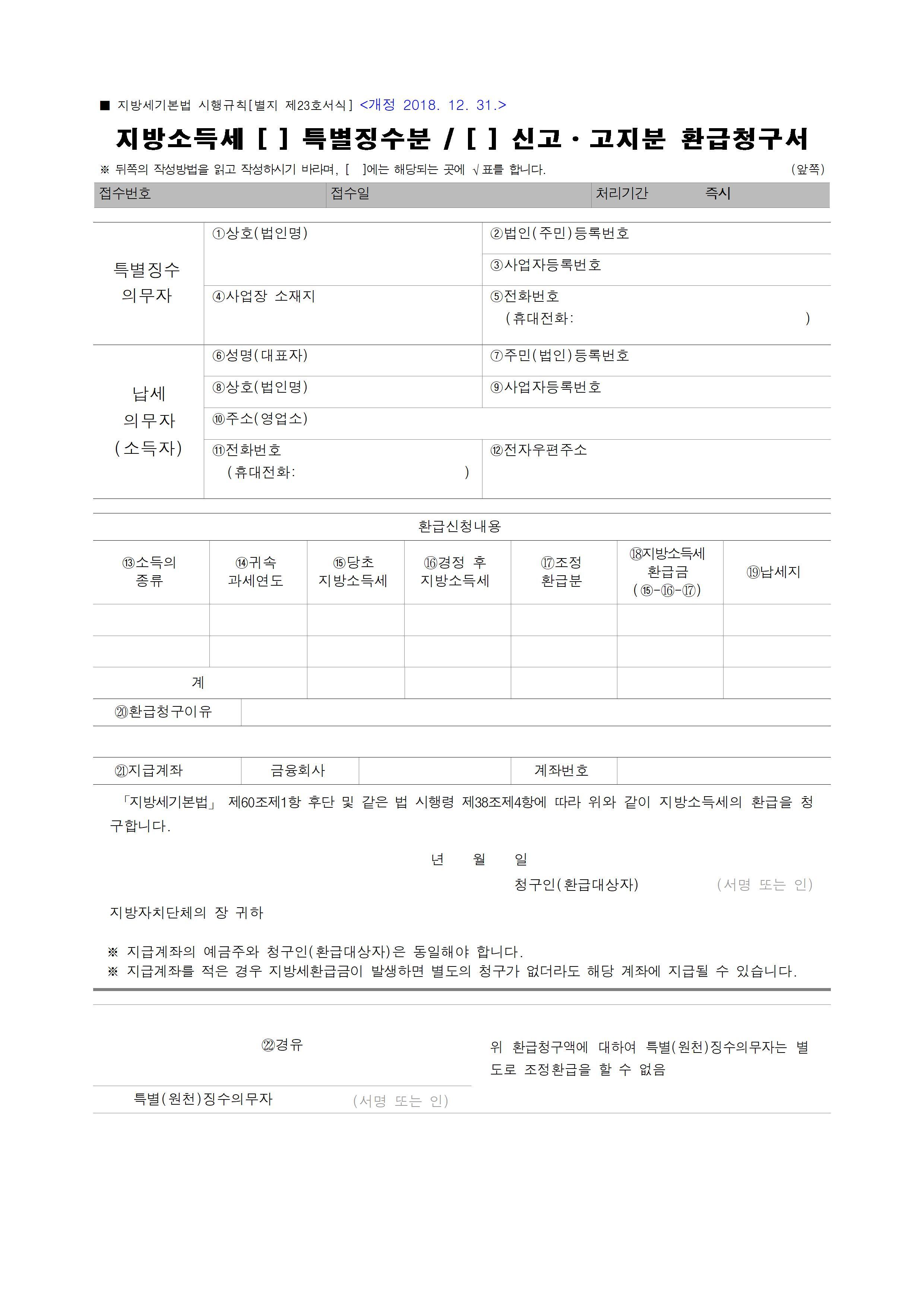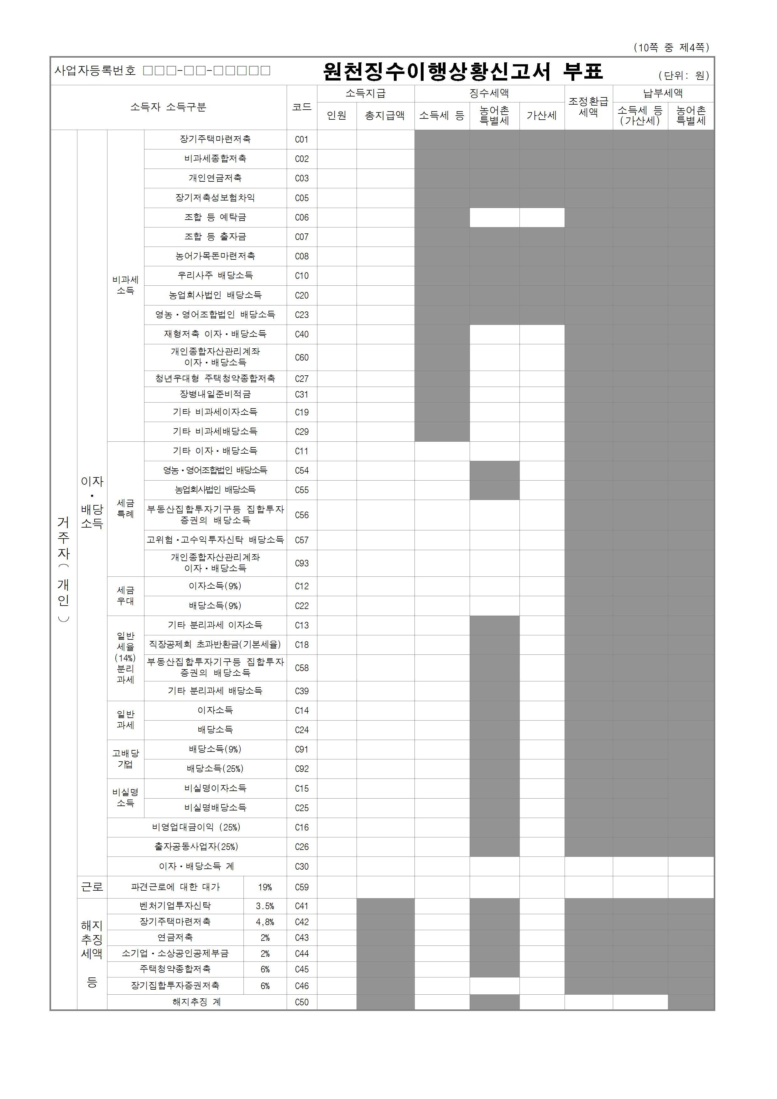 회사 : 위택스(wetax) 지방소득세 연말정산 환급신청 작성자주황규|작성시간21.01.15|조회수2,265 목록 댓글 0 글자크기 작게가 글자크기 크게가 [별지 제21호서식] 원천징수이행상황신고서¸ 원천징수세액환급신청서.hwp68.50KB[별지 제21호서식] 원천징수이행상황신고서¸ 원천징수세액환급신청서.pdf195.26KB[별지 제23호서식] 지방소득세(특별징수분¸ 신고ㆍ고지분) 환급청구서¸ 지방세환급금 지급청구서.hwp24.00KB[별지 제23호서식] 지방소득세(특별징수분¸ 신고ㆍ고지분) 환급청구서¸ 지방세환급금 지급청구서.pdf118.27KB[별지 제42호의2서식] 지방소득세 특별징수 계산서 및 명세서.hwp20.50KB[별지 제42호의2서식] 지방소득세 특별징수 계산서 및 명세서.pdf72.80KB 첨부파일첨부된 파일이 24개 있습니다. png 파일 지방소득세 연말정산 환급신청.png 다운로드 jpg 파일 위택스 연말정산 환급신청.jpg 다운로드 hwp 파일 [별지 제21호서식] 원천징수이행상황신고서¸ 원천징수세액환급신청서.hwp 다운로드 hwp 파일 [별지 제23호서식] 지방소득세(특별징수분¸ 신고ㆍ고지분) 환급청구서¸ 지방세환급금 지급청구서.hwp 다운로드 pdf 파일 [별지 제21호서식] 원천징수이행상황신고서¸ 원천징수세액환급신청서.pdf 다운로드 pdf 파일 [별지 제23호서식] 지방소득세(특별징수분¸ 신고ㆍ고지분) 환급청구서¸ 지방세환급금 지급청구서.pdf 다운로드 hwp 파일 [별지 제42호의2서식] 지방소득세 특별징수 계산서 및 명세서.hwp 다운로드 pdf 파일 [별지 제42호의2서식] 지방소득세 특별징수 계산서 및 명세서.pdf 다운로드 jpg 파일 [별지 제21호서식] 원천징수이행상황신고서¸ 원천징수세액환급신청서001.jpg 다운로드 jpg 파일 [별지 제21호서식] 원천징수이행상황신고서¸ 원천징수세액환급신청서004.jpg 다운로드 jpg 파일 [별지 제21호서식] 원천징수이행상황신고서¸ 원천징수세액환급신청서002.jpg 다운로드 jpg 파일 [별지 제21호서식] 원천징수이행상황신고서¸ 원천징수세액환급신청서005.jpg 다운로드 jpg 파일 [별지 제21호서식] 원천징수이행상황신고서¸ 원천징수세액환급신청서003.jpg 다운로드 jpg 파일 [별지 제21호서식] 원천징수이행상황신고서¸ 원천징수세액환급신청서007.jpg 다운로드 jpg 파일 [별지 제21호서식] 원천징수이행상황신고서¸ 원천징수세액환급신청서008.jpg 다운로드 jpg 파일 [별지 제21호서식] 원천징수이행상황신고서¸ 원천징수세액환급신청서006.jpg 다운로드 jpg 파일 [별지 제21호서식] 원천징수이행상황신고서¸ 원천징수세액환급신청서009.jpg 다운로드 jpg 파일 [별지 제21호서식] 원천징수이행상황신고서¸ 원천징수세액환급신청서010.jpg 다운로드 jpg 파일 [별지 제23호서식] 지방소득세(특별징수분¸ 신고ㆍ고지분) 환급청구서¸ 지방세환급금 지급청구서001.jpg 다운로드 jpg 파일 [별지 제23호서식] 지방소득세(특별징수분¸ 신고ㆍ고지분) 환급청구서¸ 지방세환급금 지급청구서002.jpg 다운로드 jpg 파일 [별지 제42호의2서식] 지방소득세 특별징수 계산서 및 명세서002.jpg 다운로드 jpg 파일 [별지 제42호의2서식] 지방소득세 특별징수 계산서 및 명세서001.jpg 다운로드 jpg 파일 [별지 제23호서식] 지방소득세(특별징수분¸ 신고ㆍ고지분) 환급청구서¸ 지방세환급금 지급청구서003.jpg 다운로드 jpg 파일 주황규.jpg 다운로드 다음검색 현재 게시글 추가 기능 열기 북마크 공유하기 신고 센터로 신고 댓글 댓글 0 댓글쓰기 답글쓰기 댓글 리스트