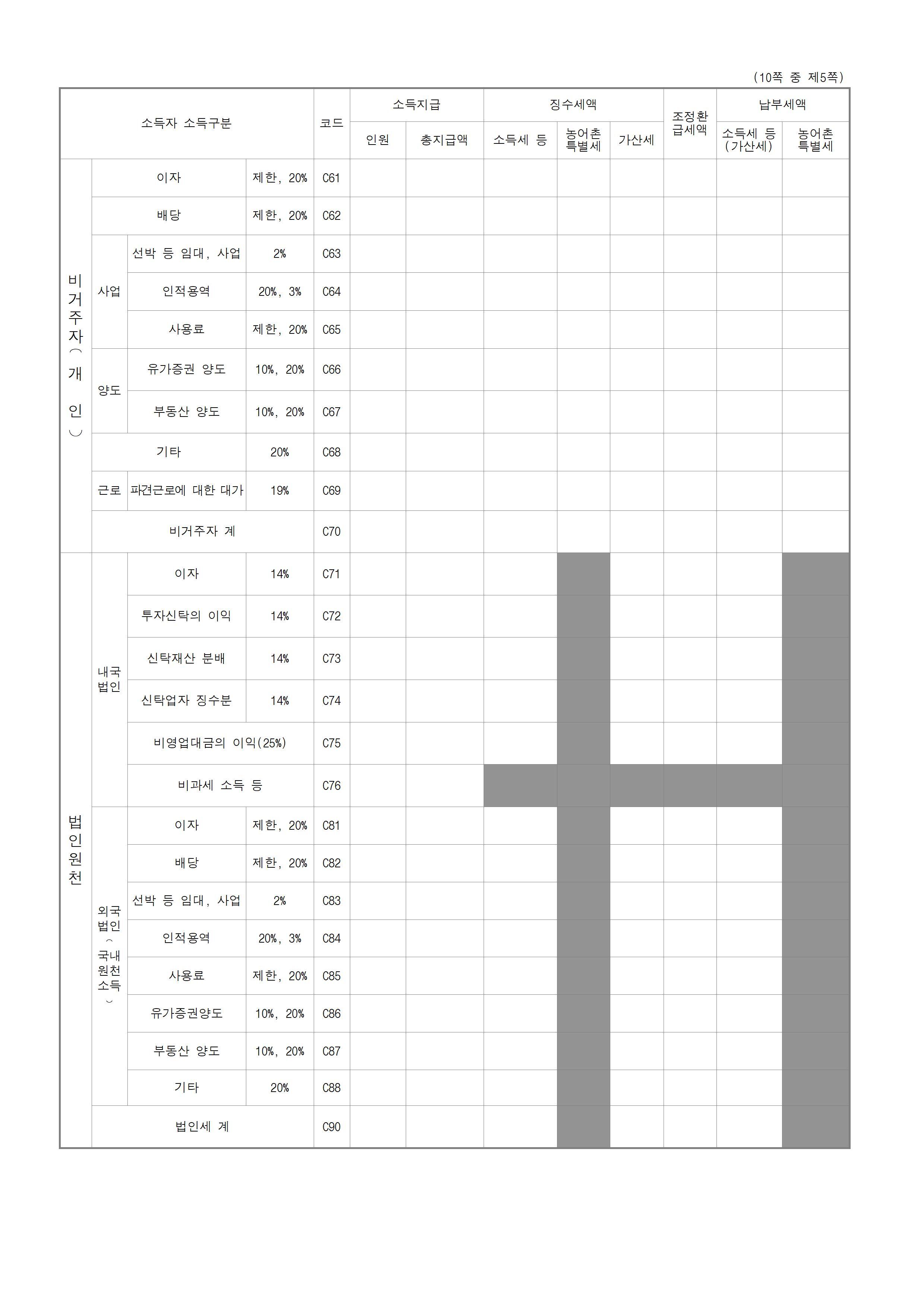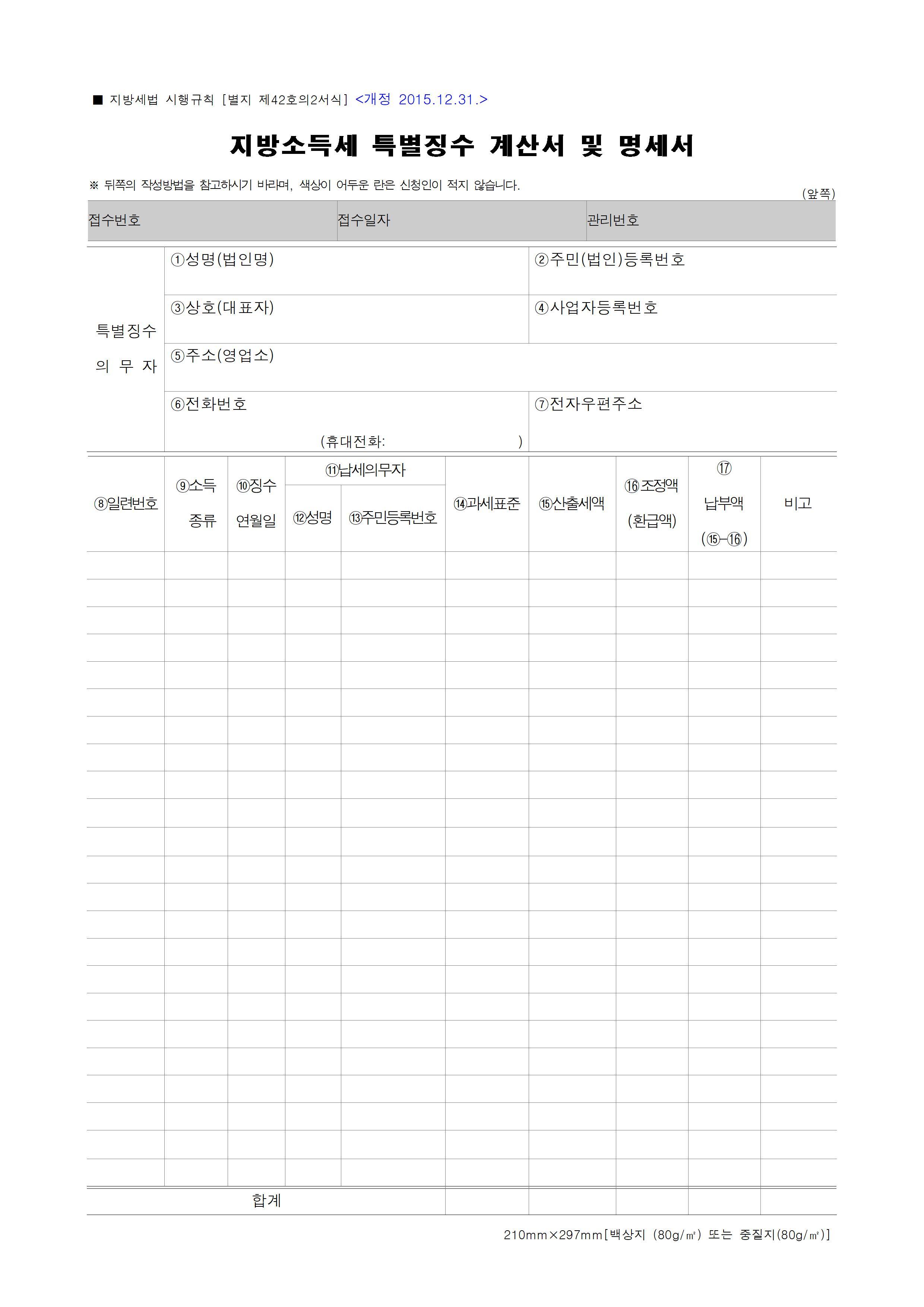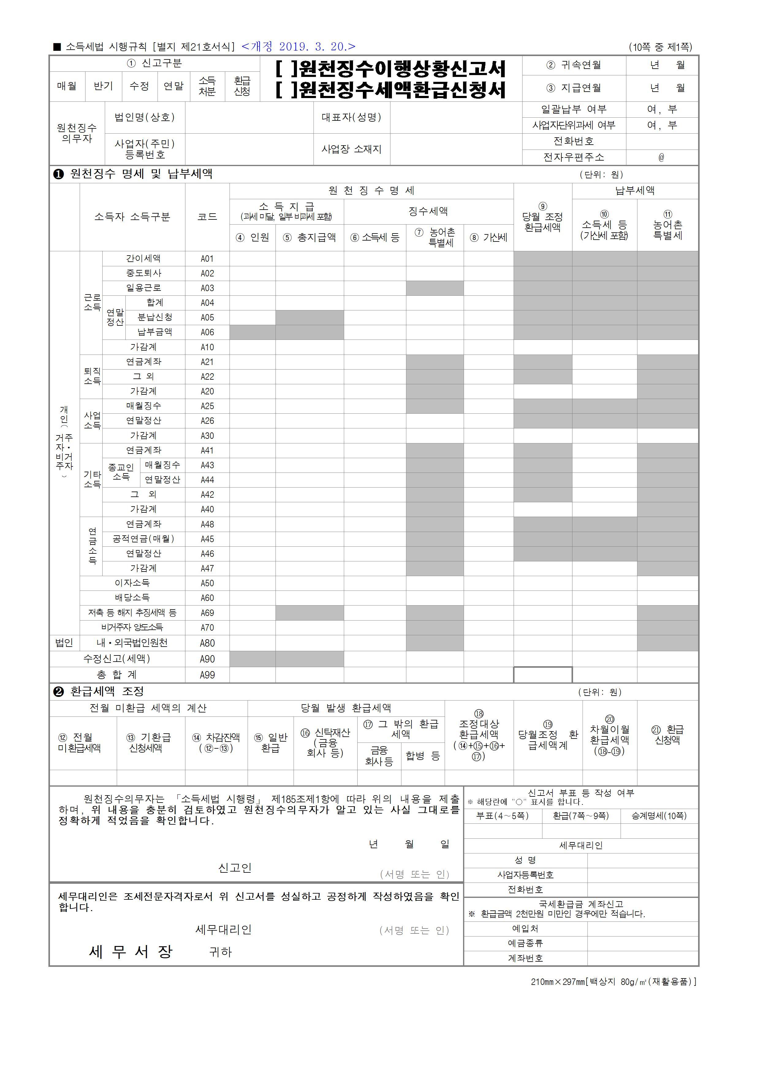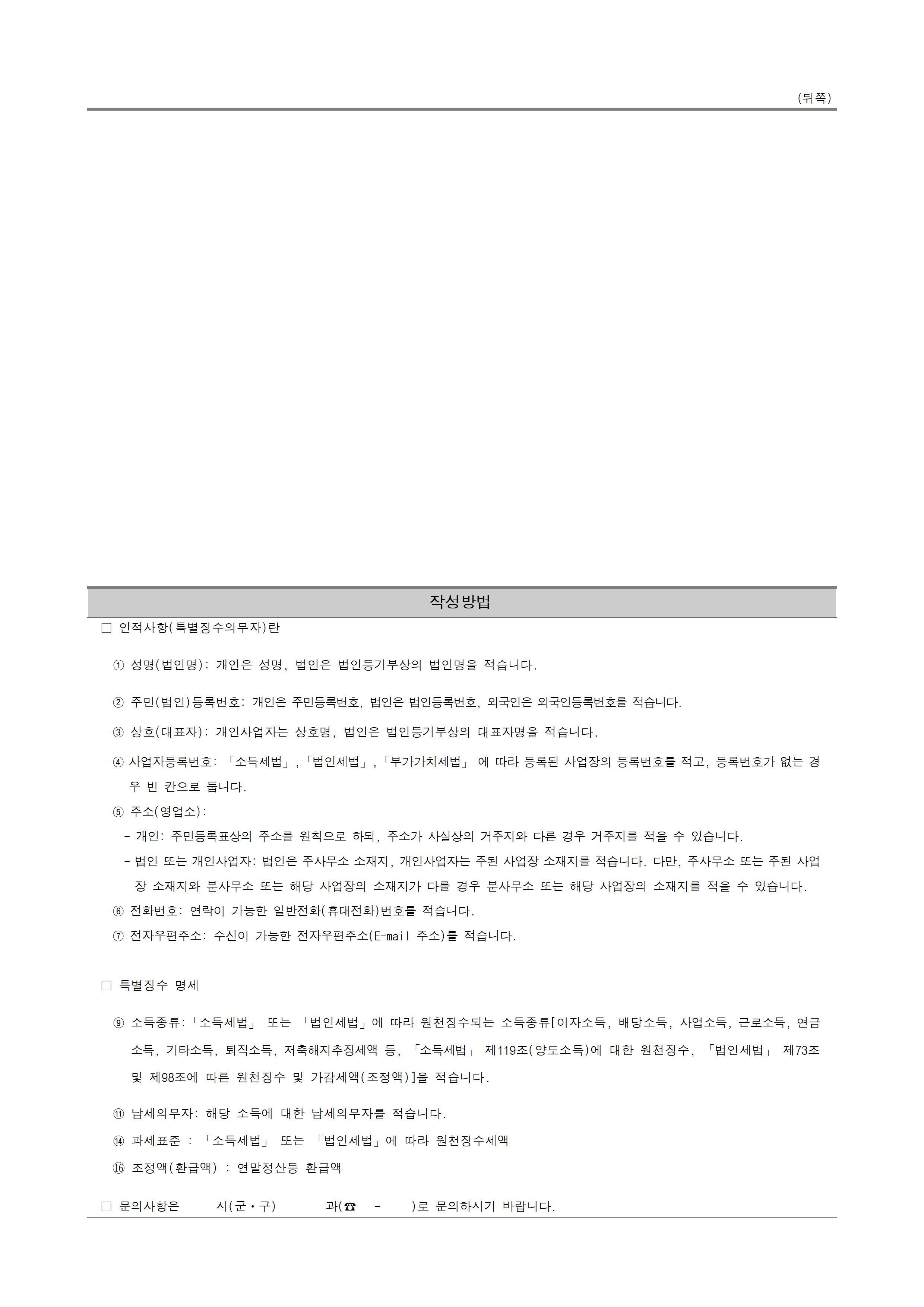 회사 : 위택스(wetax) 지방소득세 연말정산 환급신청 작성자주황규|작성시간21.01.15|조회수2,265 목록 댓글 0 글자크기 작게가 글자크기 크게가 [별지 제21호서식] 원천징수이행상황신고서¸ 원천징수세액환급신청서.hwp68.50KB[별지 제21호서식] 원천징수이행상황신고서¸ 원천징수세액환급신청서.pdf195.26KB[별지 제23호서식] 지방소득세(특별징수분¸ 신고ㆍ고지분) 환급청구서¸ 지방세환급금 지급청구서.hwp24.00KB[별지 제23호서식] 지방소득세(특별징수분¸ 신고ㆍ고지분) 환급청구서¸ 지방세환급금 지급청구서.pdf118.27KB[별지 제42호의2서식] 지방소득세 특별징수 계산서 및 명세서.hwp20.50KB[별지 제42호의2서식] 지방소득세 특별징수 계산서 및 명세서.pdf72.80KB 첨부파일첨부된 파일이 24개 있습니다. png 파일 지방소득세 연말정산 환급신청.png 다운로드 jpg 파일 위택스 연말정산 환급신청.jpg 다운로드 hwp 파일 [별지 제21호서식] 원천징수이행상황신고서¸ 원천징수세액환급신청서.hwp 다운로드 hwp 파일 [별지 제23호서식] 지방소득세(특별징수분¸ 신고ㆍ고지분) 환급청구서¸ 지방세환급금 지급청구서.hwp 다운로드 pdf 파일 [별지 제21호서식] 원천징수이행상황신고서¸ 원천징수세액환급신청서.pdf 다운로드 pdf 파일 [별지 제23호서식] 지방소득세(특별징수분¸ 신고ㆍ고지분) 환급청구서¸ 지방세환급금 지급청구서.pdf 다운로드 hwp 파일 [별지 제42호의2서식] 지방소득세 특별징수 계산서 및 명세서.hwp 다운로드 pdf 파일 [별지 제42호의2서식] 지방소득세 특별징수 계산서 및 명세서.pdf 다운로드 jpg 파일 [별지 제21호서식] 원천징수이행상황신고서¸ 원천징수세액환급신청서001.jpg 다운로드 jpg 파일 [별지 제21호서식] 원천징수이행상황신고서¸ 원천징수세액환급신청서004.jpg 다운로드 jpg 파일 [별지 제21호서식] 원천징수이행상황신고서¸ 원천징수세액환급신청서002.jpg 다운로드 jpg 파일 [별지 제21호서식] 원천징수이행상황신고서¸ 원천징수세액환급신청서005.jpg 다운로드 jpg 파일 [별지 제21호서식] 원천징수이행상황신고서¸ 원천징수세액환급신청서003.jpg 다운로드 jpg 파일 [별지 제21호서식] 원천징수이행상황신고서¸ 원천징수세액환급신청서007.jpg 다운로드 jpg 파일 [별지 제21호서식] 원천징수이행상황신고서¸ 원천징수세액환급신청서008.jpg 다운로드 jpg 파일 [별지 제21호서식] 원천징수이행상황신고서¸ 원천징수세액환급신청서006.jpg 다운로드 jpg 파일 [별지 제21호서식] 원천징수이행상황신고서¸ 원천징수세액환급신청서009.jpg 다운로드 jpg 파일 [별지 제21호서식] 원천징수이행상황신고서¸ 원천징수세액환급신청서010.jpg 다운로드 jpg 파일 [별지 제23호서식] 지방소득세(특별징수분¸ 신고ㆍ고지분) 환급청구서¸ 지방세환급금 지급청구서001.jpg 다운로드 jpg 파일 [별지 제23호서식] 지방소득세(특별징수분¸ 신고ㆍ고지분) 환급청구서¸ 지방세환급금 지급청구서002.jpg 다운로드 jpg 파일 [별지 제42호의2서식] 지방소득세 특별징수 계산서 및 명세서002.jpg 다운로드 jpg 파일 [별지 제42호의2서식] 지방소득세 특별징수 계산서 및 명세서001.jpg 다운로드 jpg 파일 [별지 제23호서식] 지방소득세(특별징수분¸ 신고ㆍ고지분) 환급청구서¸ 지방세환급금 지급청구서003.jpg 다운로드 jpg 파일 주황규.jpg 다운로드 다음검색 현재 게시글 추가 기능 열기 북마크 공유하기 신고 센터로 신고 댓글 댓글 0 댓글쓰기 답글쓰기 댓글 리스트