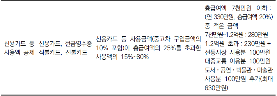 근로소득이 있는 거주자 본인과 연간소득금액이 100만원 이하인 배우자 및 생계를 같이 하는 직계존비속(배우자의 직계존속과 입양자 포함)이 국내에서 사업자로부터 재화나 용역을 제공받고 신용카드·기명식선불카드, 직불카드 또는 현금영수증을 사용하여 그 대가로 지급 하는 금액과 학원의 수강료 등을 지로(지로이용기관의 상호, 대표자성명, 사업자등록번호, 지로납부자의 성명이 포함된 것에 한함)로 납부한 금액 중 일정금액을 소득금액에서 공제한다.
