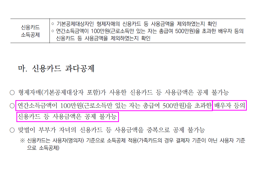 ▷ 연간소득금액이 100만원(근로소득만 있는 자는 총급여 500만원)을 초과한 배우자등의 신용카드 등 사용금액을 공제 불가