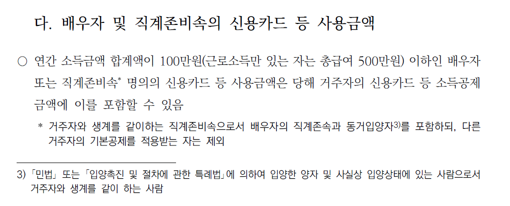 - 연간 소득금액 합계액이 100만원(근로소득만 있는 자는 총급여 500만원) 이하인 배우자 또는 직계존비속 명의의 신용카드 등 사용금액은 근로자의 신용카드 등 소득공제금액에 포함시킬 수 있음 (다른 거주자의 기본공제를 적용받는 자, 형제자매는 제외)