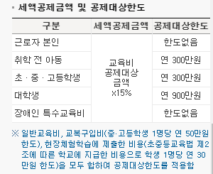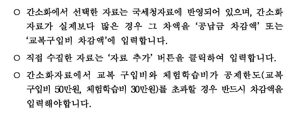 - 본인이 부담하지 않은 교육비, 교복구입비, 체험학습비 등은 공제대상이 아니므로 차감하고 공제받아야 합니다.(예) 지방자체단체 등으로부터 지원받은 교복구입비 등