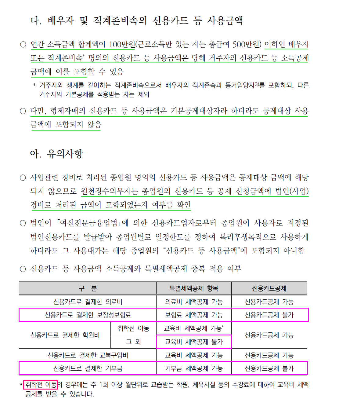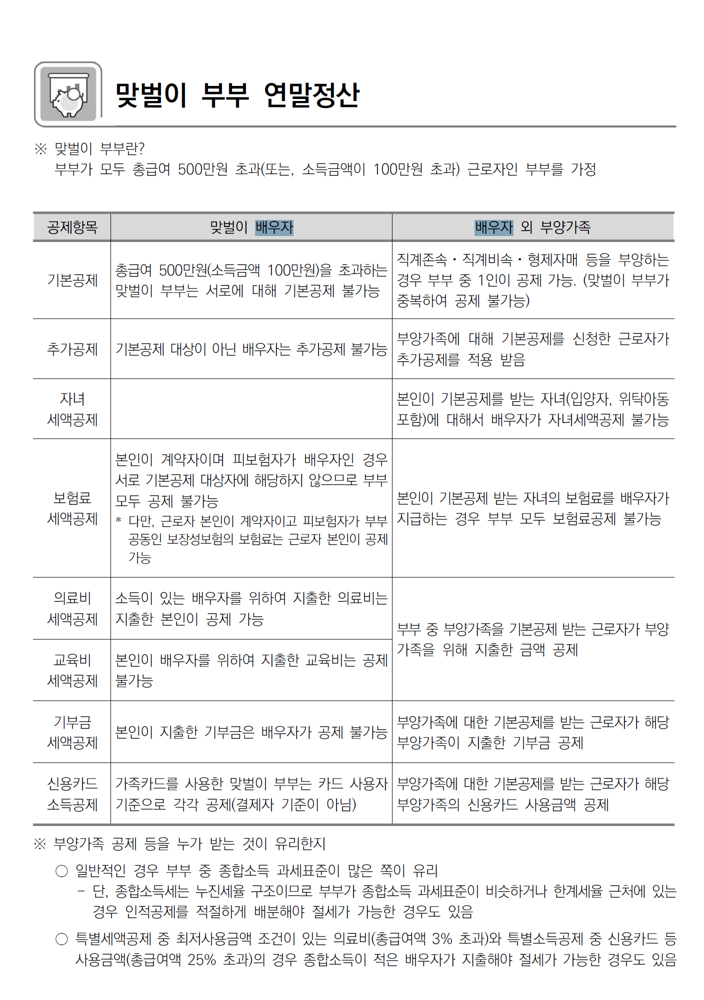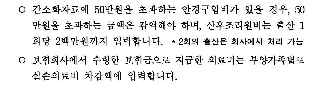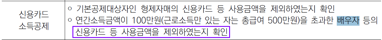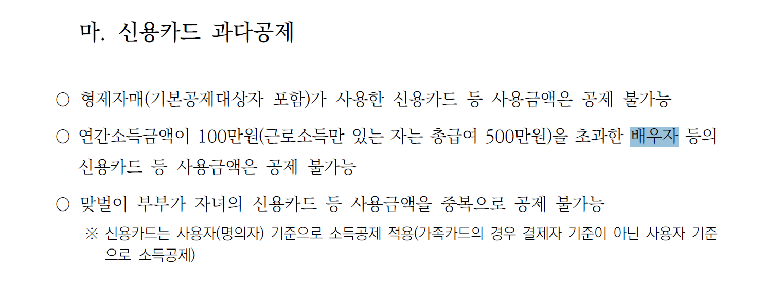 배우자 연간 소득금액 100만원 초과 배우자의 기부금, 교육비, 신용카드등사용금액 불가 / 의료비 근로자가 직접 부담