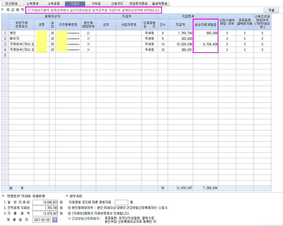 실손의료보험금 수령내역을 참고하여 의료비 세액공제 대상에서 제외하시기 바랍니다.