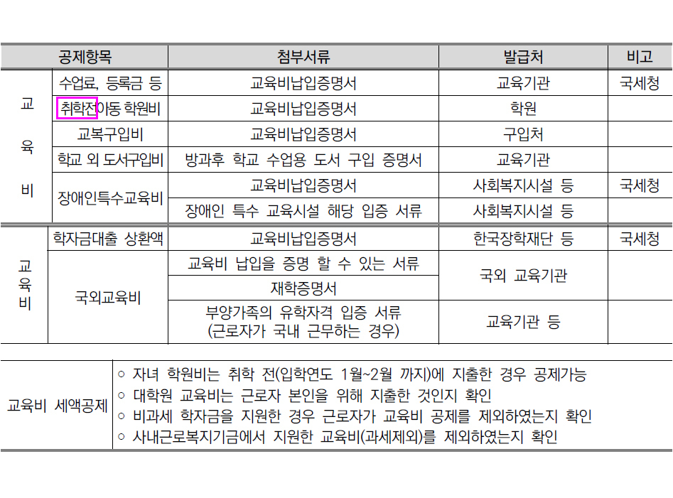 · (학원 및 체육시설) 소득세법 제59조의4 제3항 제1호 라목에 따른 학원 및 체육시설에서 월단위로 실시하는 교습과정(1주 1회 이상 실시하는 과정만 해당)에 지급한 교육비(초등학교 취학 전 아동만 해당)