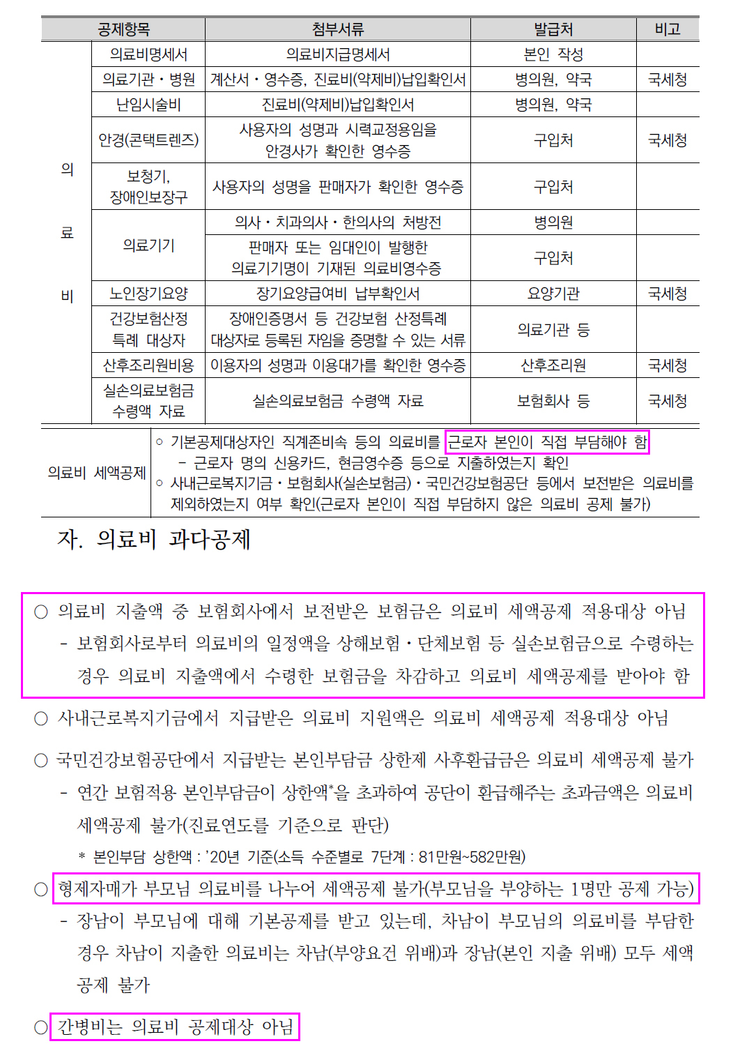 다만, 의료비의 경우에도 소득이 있는 부양가족이 직접 지출한 의료비는 공제 대상이 아니며,