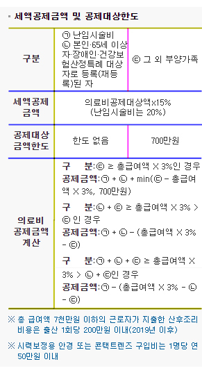 · 세액공제대상금액 : 근로자 본인 및 기본공제대상자(나이 및 소득 제한없음)을 위하여 실제 지출한 의료비부담액 중 근로자 총 급여액의 3%를 초과한 금액