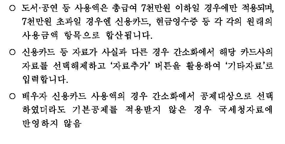 - 연말정산간소화에서 제공하는 자료 중 다른사람의 기본공제대상자인 부양 가족을 위해 지출한 교육비는 세액공제대상에 해당하지 아니하므로 이에 대해서는 사용하면 안됨(예)맞벌이 배우자를 위해 지출한 교육비는 공제대상에서 제외