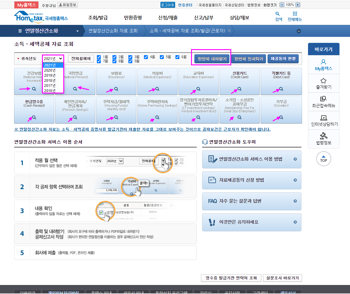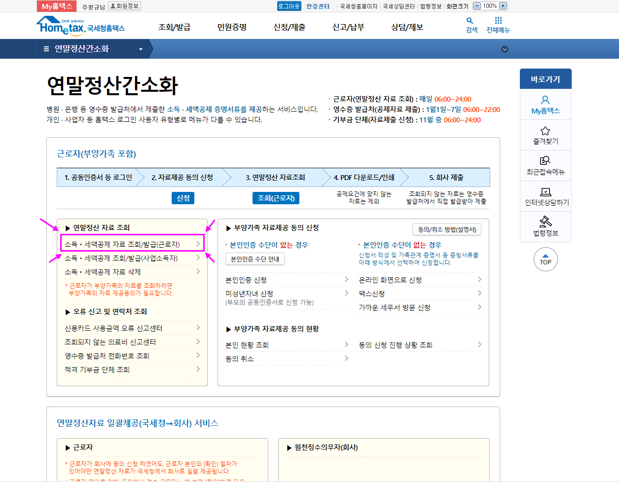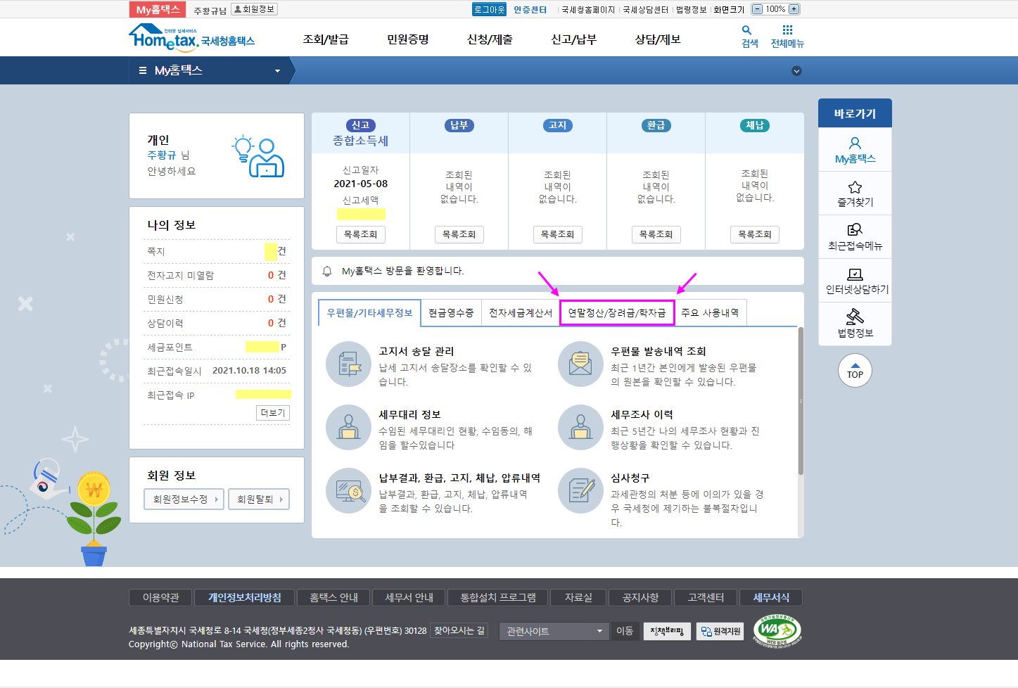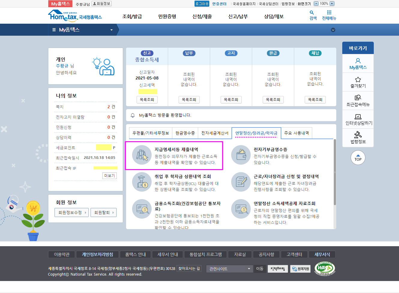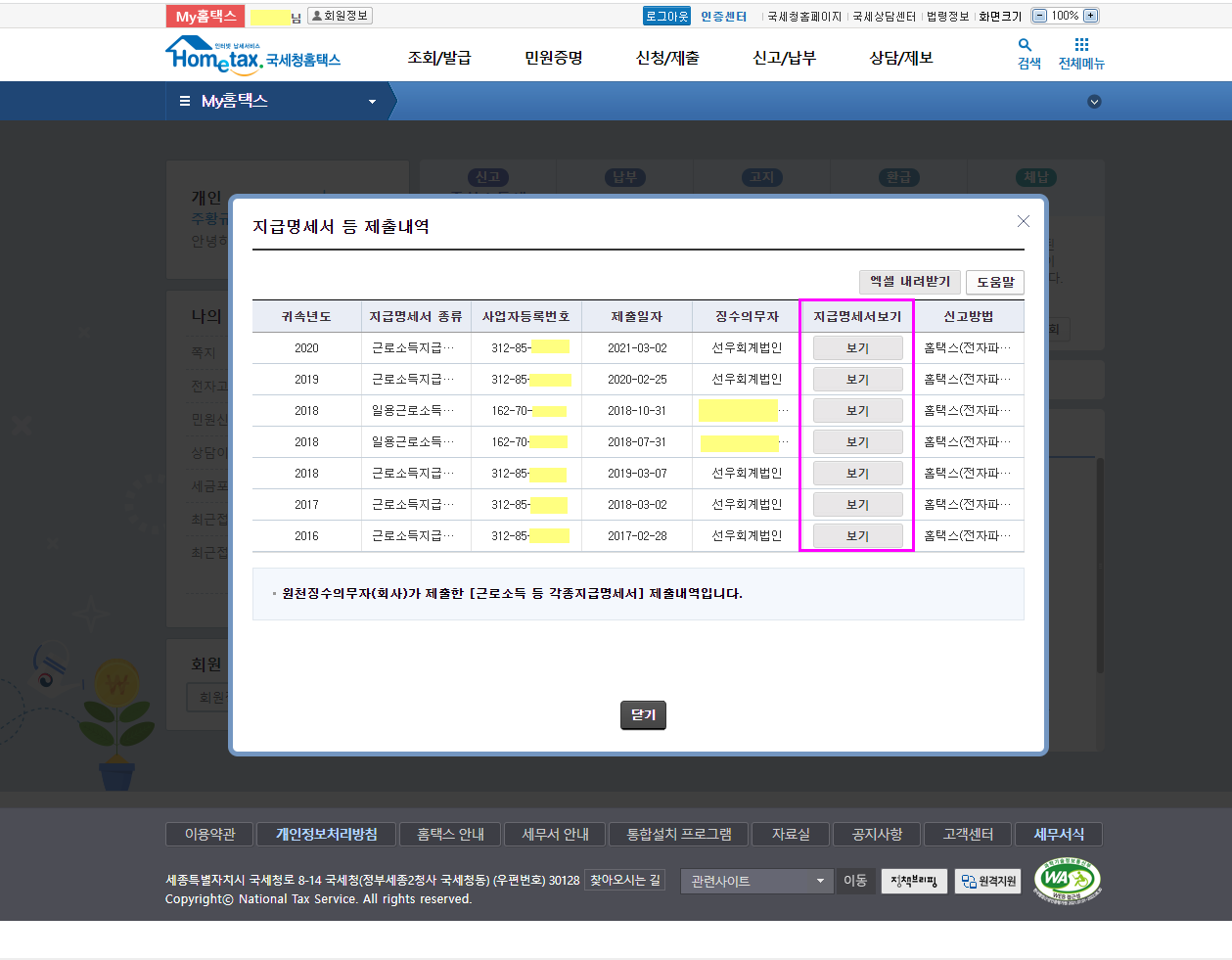 근로소득원천징수영수증 기한후 (전직장 + 현직장)합산신고 (홈택스 > My홈택스 > 연말정산/장려금/학자금 > 지급명세서 등 제출내역)