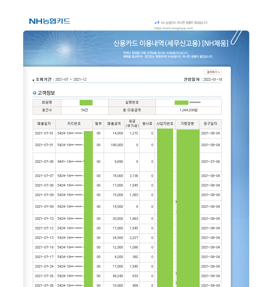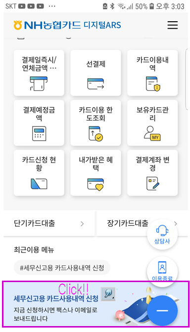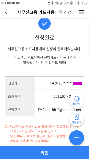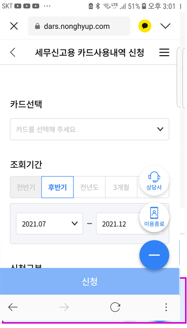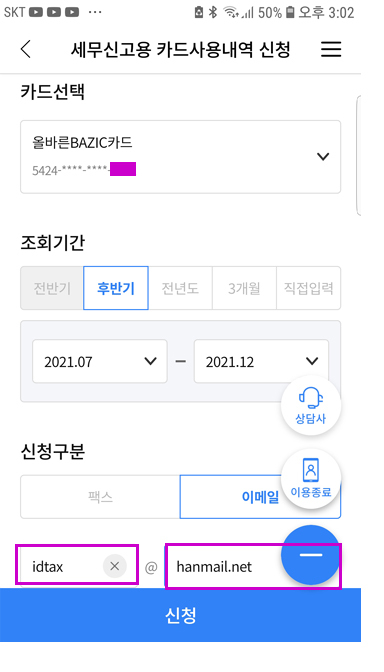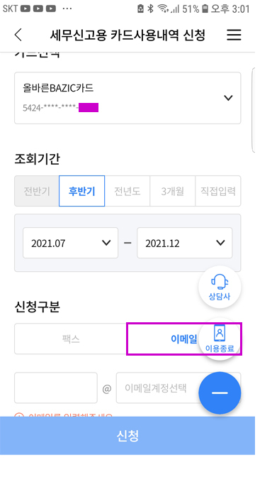 NH농협카드 1644-4000 > 디지털ARS 연결 간편링크 > 세무신고용 카드사용내역 신청 > 신청구분 이메일 작성자주황규|작성시간22.01.18|조회수502 목록 댓글 0 글자크기 작게가 글자크기 크게가 반드시 이메일로 신청 팩스 안 받습니다. 하단 아파트 관리비 카과 -> 삭제 또는 일반 다음검색 현재 게시글 추가 기능 열기 북마크 공유하기 신고 센터로 신고 댓글 댓글 0 댓글쓰기 답글쓰기 댓글 리스트
