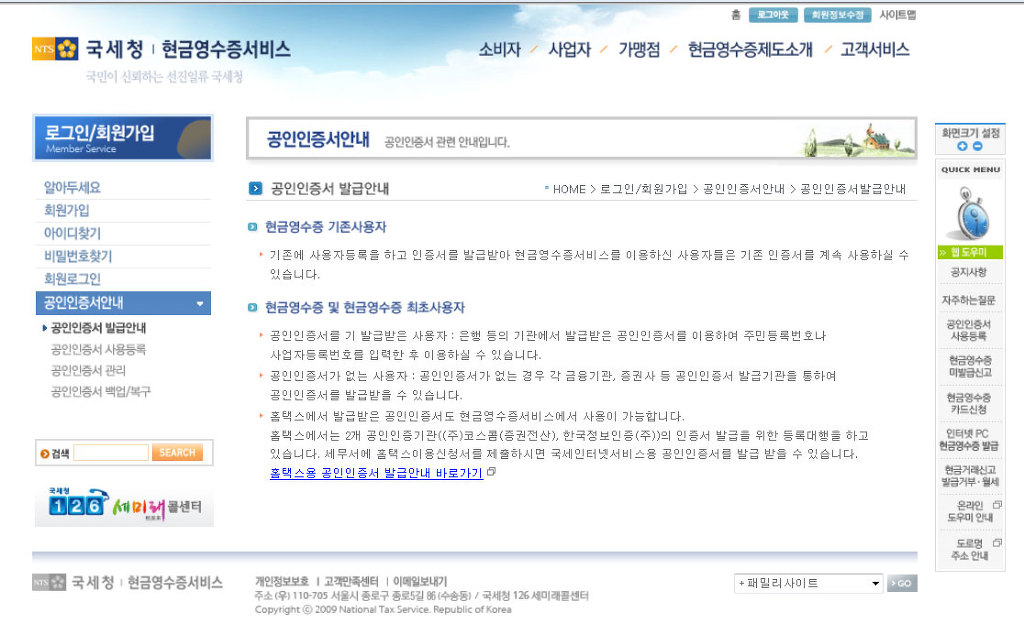 - 기존에 사용자등록을 하고 인증서를 발급받아 현금영수증서비스를 이용하신 사용자들은 기존 인증서를 계속 사용하실 수 있습니다.