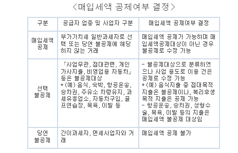 「사업무관, 접대관련, 개인가사 지출, 비영업용 자동차」등은 불공제 대상 * (예) 음식, 숙박, 항공운송, 승차권, 주유소 차량유지, 과세유흥업소, 자동차구입, 골프연습장, 목욕, 이발 등 |