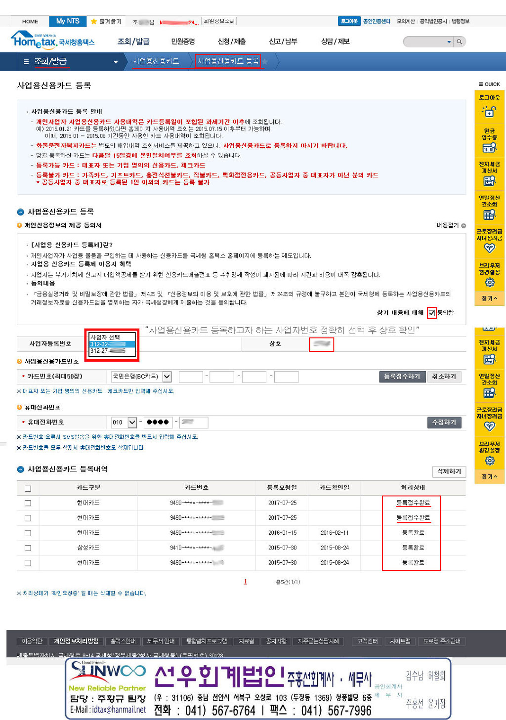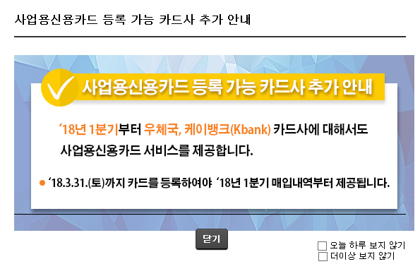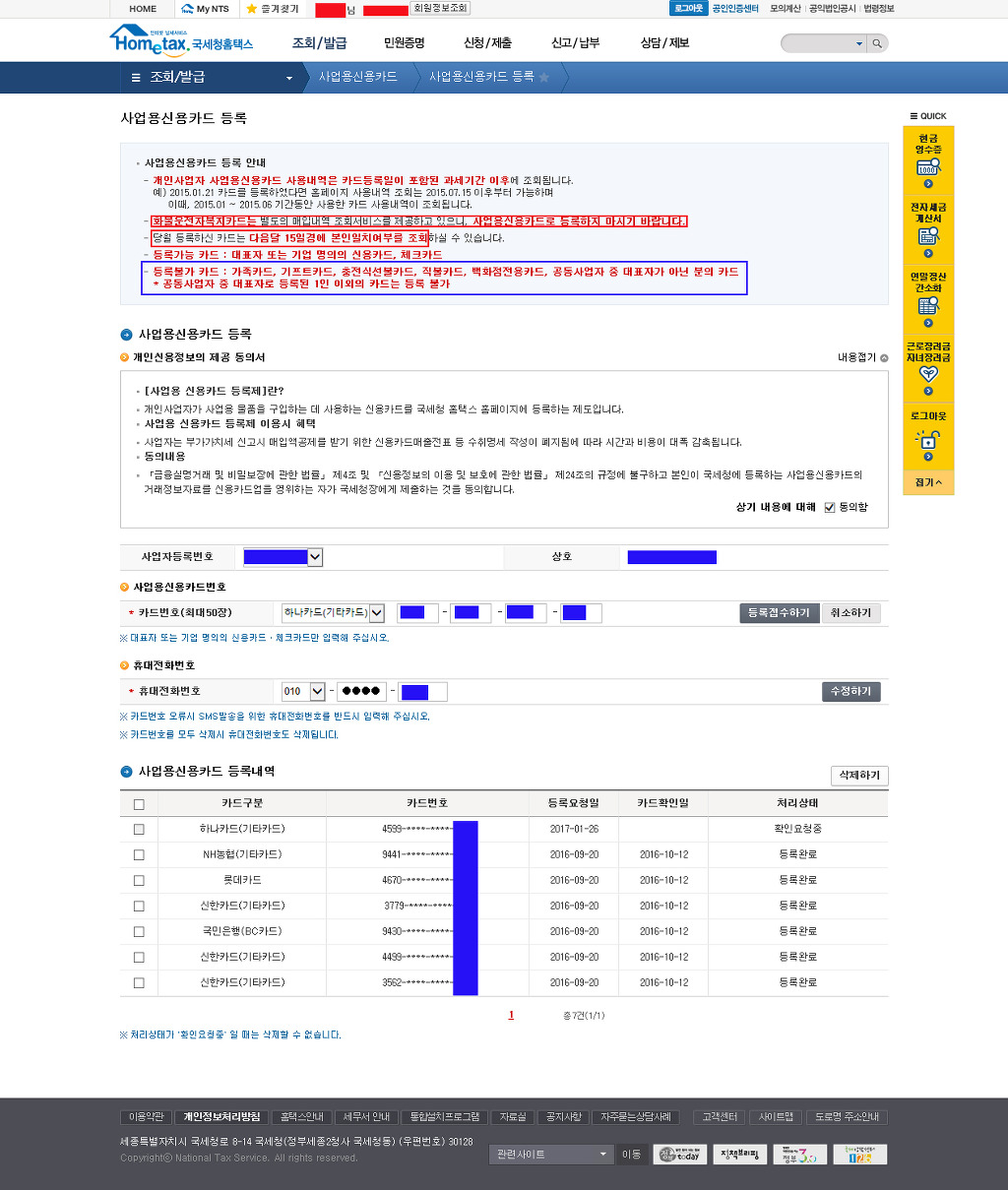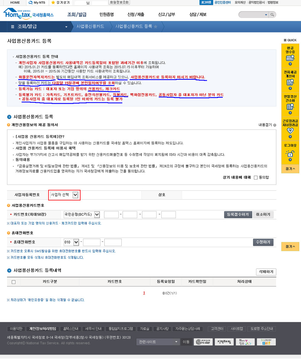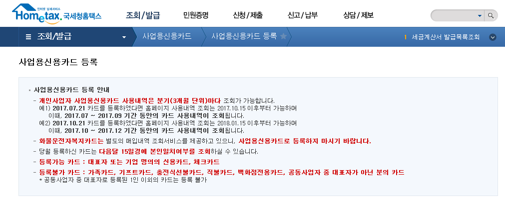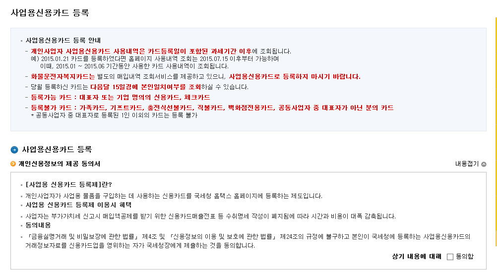 - 개인사업자가 사업용 물품을 구입하는 데 사용하는 신용카드를 국세청 홈택스 홈페이지에 등록하는 제도입니다.