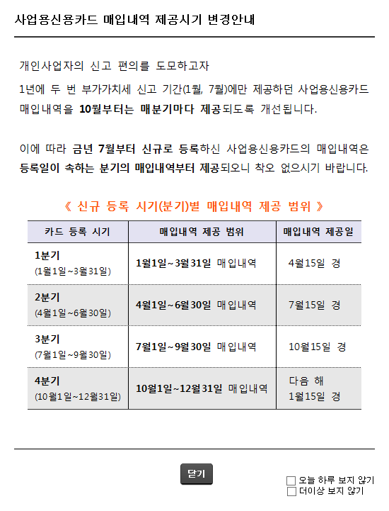 - 조회/발급 > 현금영수증 > 사업용 신용카드 > 사업용 신용카드 등록등록 시기(분기)별 매입내역 제공 범위카드 등록 시기 매입내역 제공 범위 매입내역 제공일 1분기