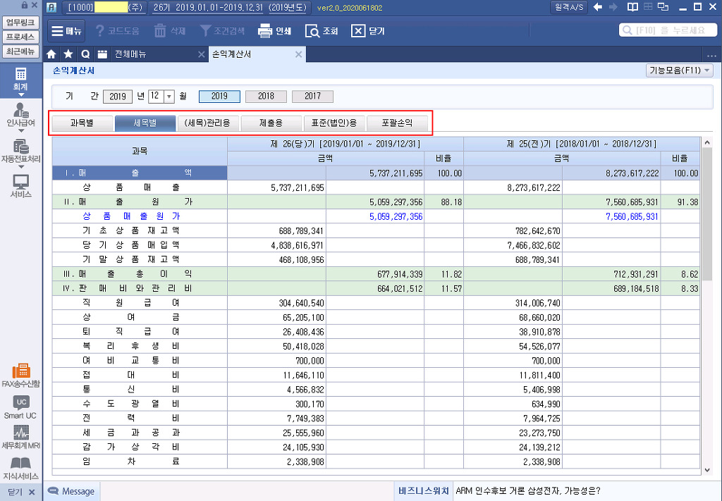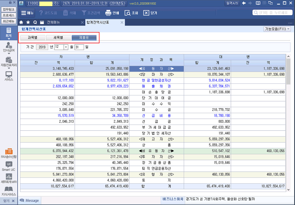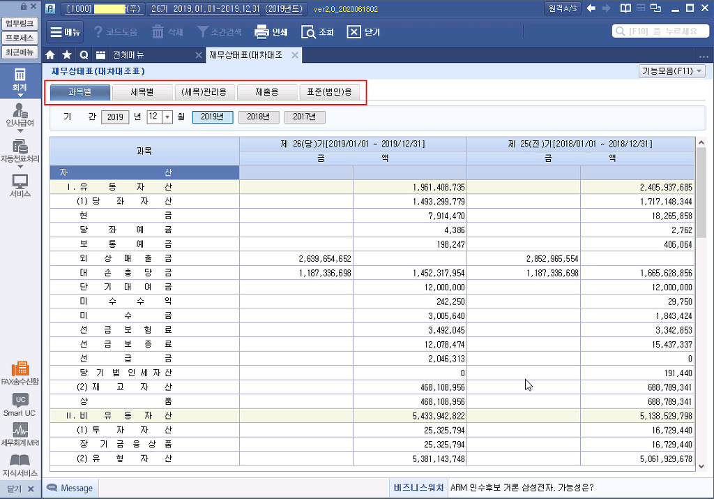 재무제표 탭 (Tab) 과목별 / 세목별 / (세목)관리용 / 제출용 / 표준(법인)용 / 포괄손익 작성자주황규|작성시간20.07.28|조회수1,331 목록 댓글 0 글자크기 작게가 글자크기 크게가 다음검색 현재 게시글 추가 기능 열기 북마크 공유하기 신고 센터로 신고 댓글 댓글 0 댓글쓰기 답글쓰기 댓글 리스트