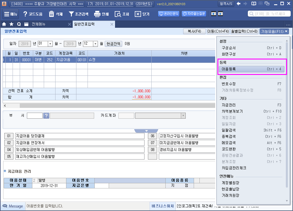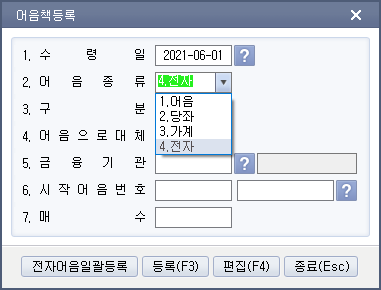 어음번호 : 직접입력 (최초등록) F2키(만기,배서,할인,부도)로 가져올 수 있다.