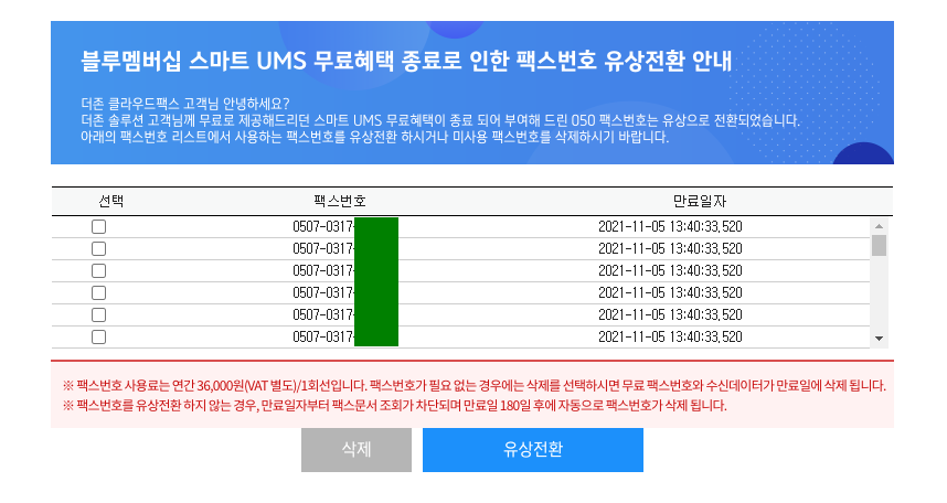 ※ 팩스번호를 유상전환 하지 않는 경우, 만료일자부터 팩스문서 조회가 차단되며 만료일 180일 후에 자동으로 팩스번호가 삭제됩니다.
