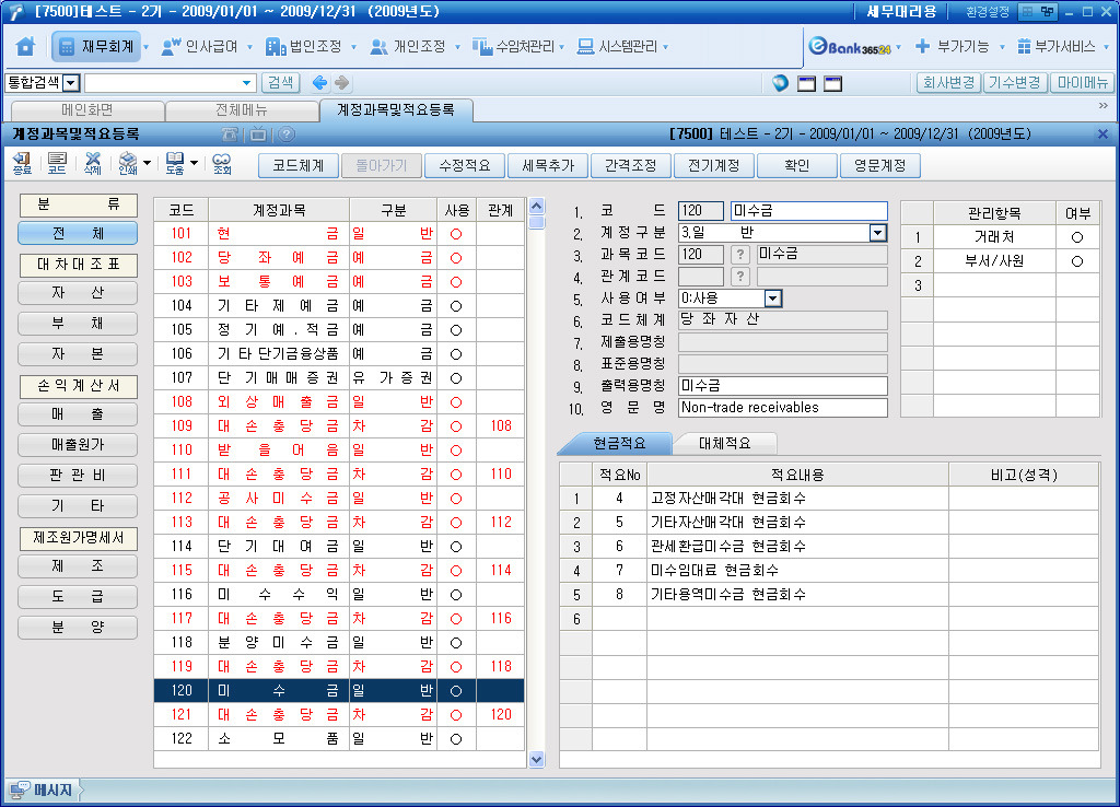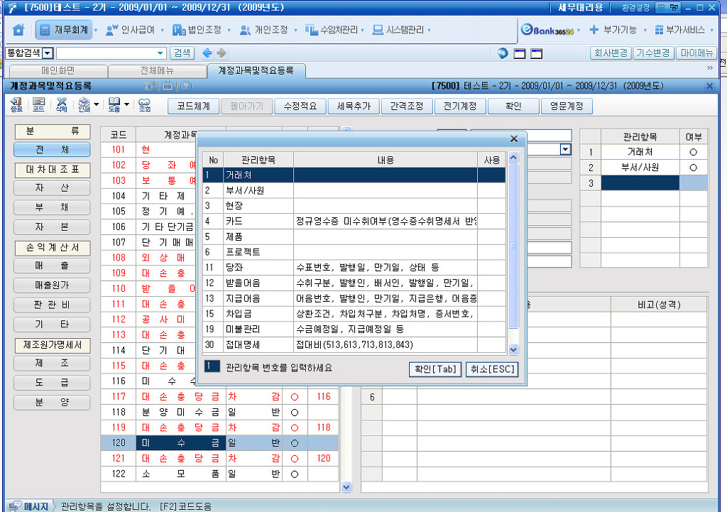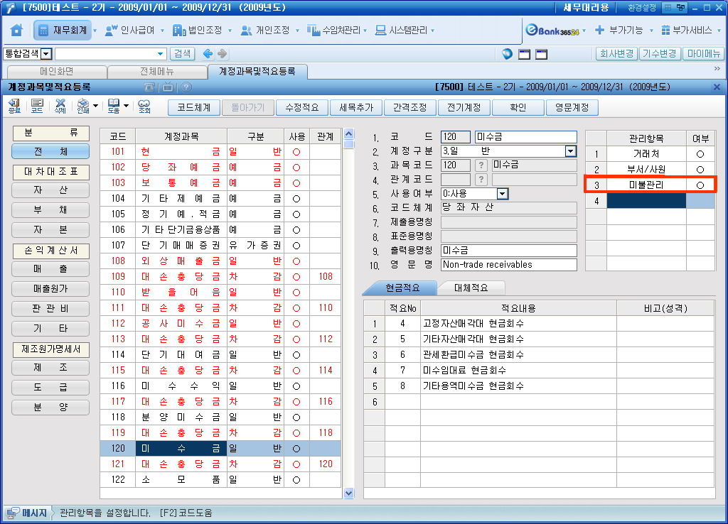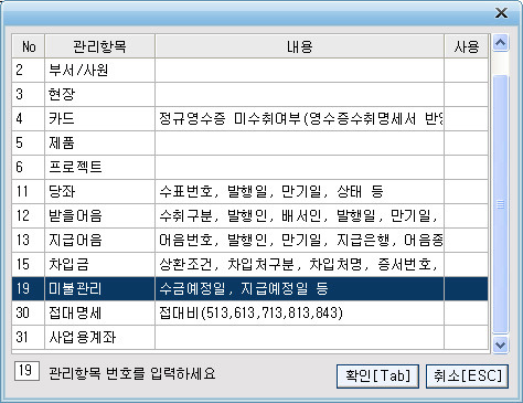 기초코드등록 - 계정과목및 적용등록 -(120) 미수금 (계정)선택 / 관리항목에서 F2 클릭 / 19번 미불관리 선택
