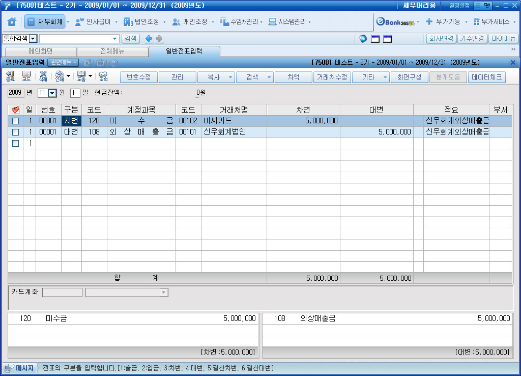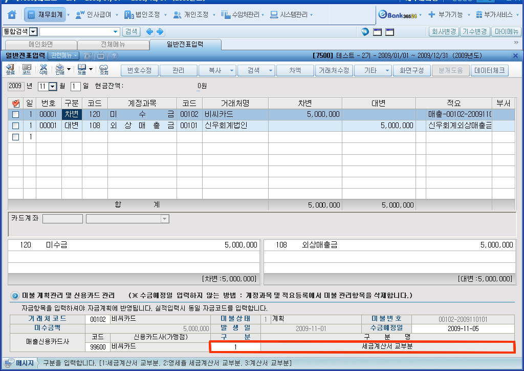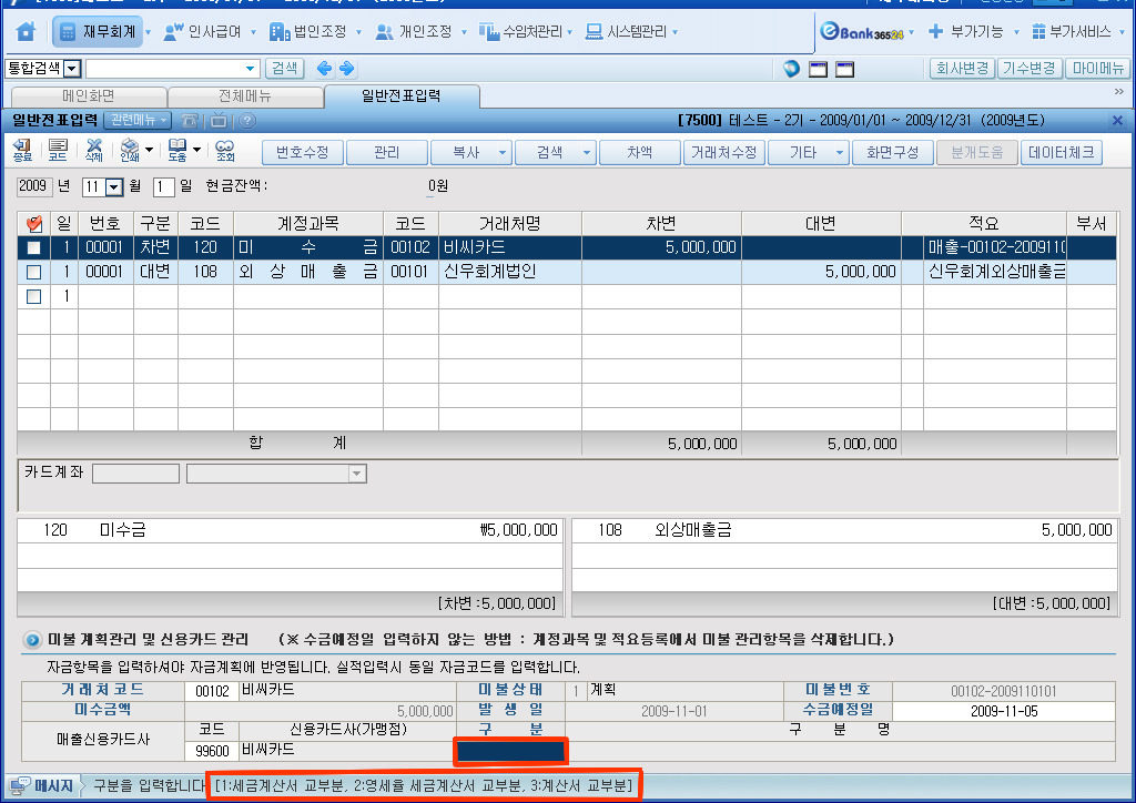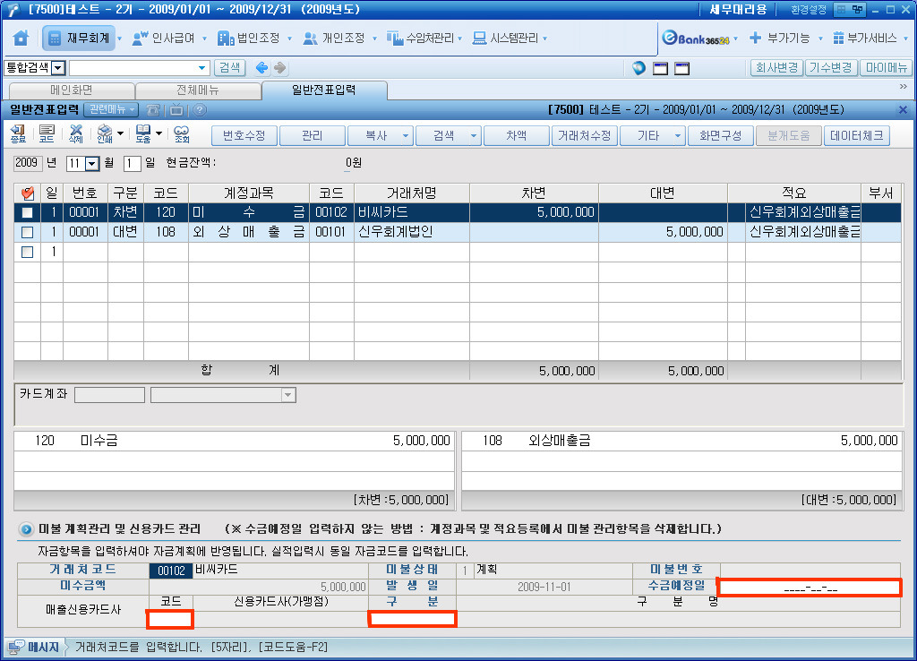 2009.11.1일 테스트(주)는 신우회계법인에게로부터 신용카드 결제 500,000을 결제받다.