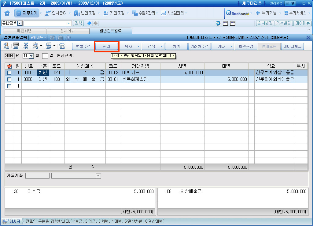 커서 미수금 클릭/ 관리 클릭(상단에 툴바에 번호수정,관리,복사,검색,차액,거래처수정,기타,화면구성,분개도움,데이터체크 중에 있음)