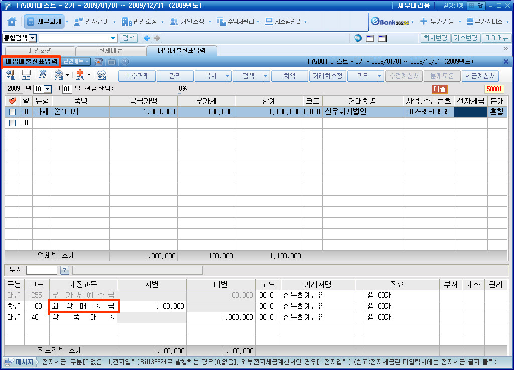 테스트(주)는 2009.10.1일 신우회계법인에서 1,100,000(공급가액 1,000,000 세액 100,000) 을 외상매출하다.