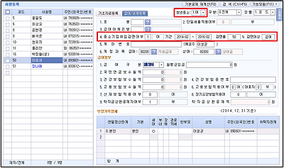 A-1. 사원등록의 중소기업취업감면여부 “여”로 설정, 감면기간과 감면율을 선택합니다. 공제감면 적용할 항목을 선택합니다.