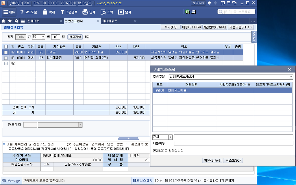 2. 코드 신용카드사(가맹점)을 반드시 입력해야 함.