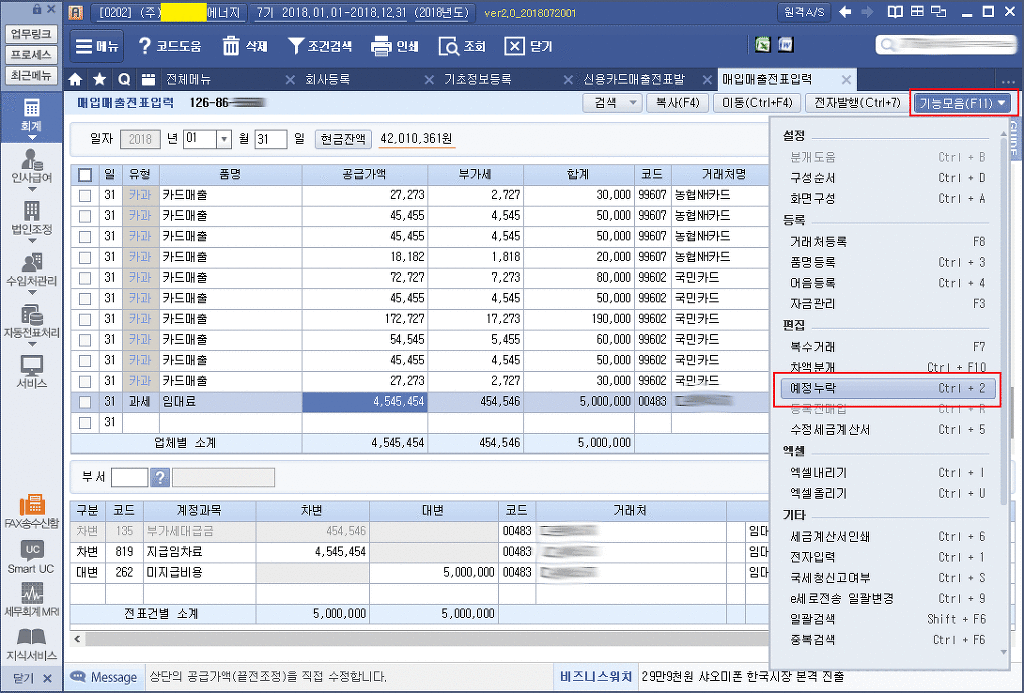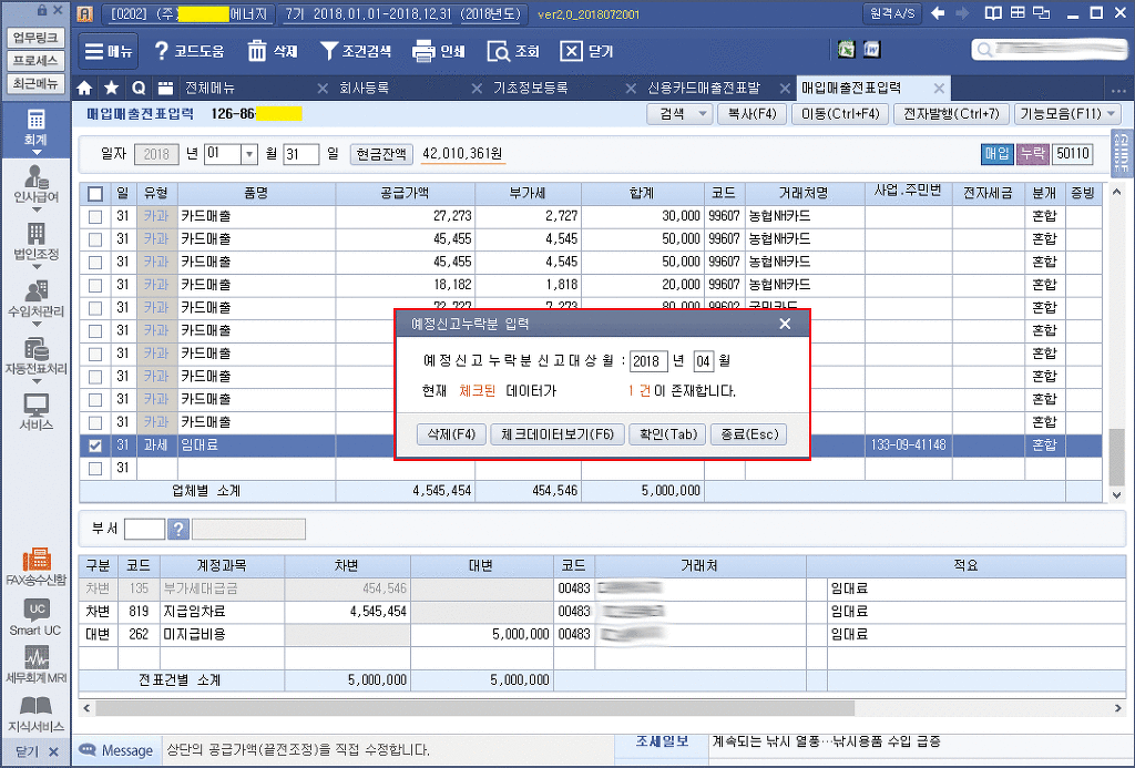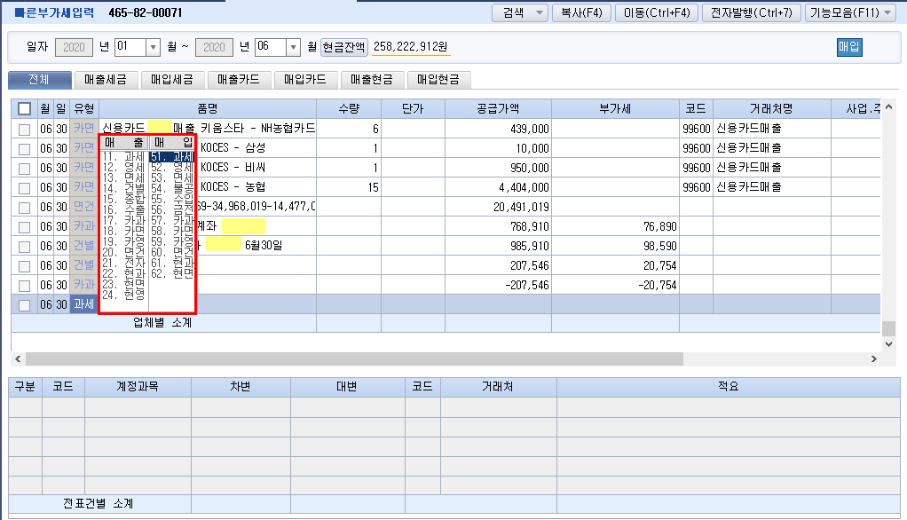 [매입매출전표입력] 세금계산서 교부 후 카드결제 미수금-미불관리, 카드로 결제 시 신용카드발행집계표에 자동 반영,예정신고누락
