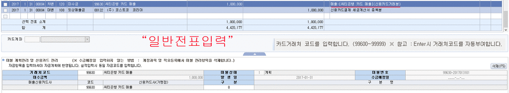 미수금의 거래처를 반드시 거래처 등록의 "카드" 탭에 있는 거래처로 매출로되어 있고 신용카드사 이름이나