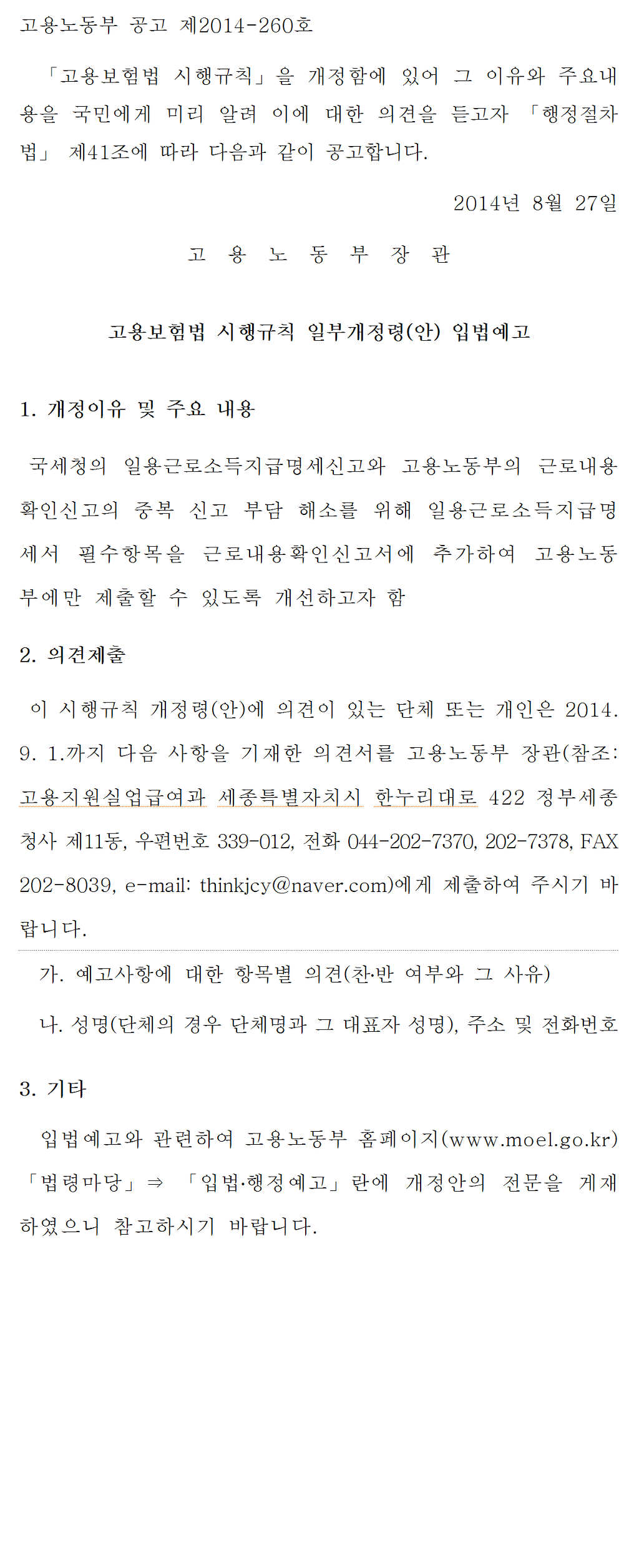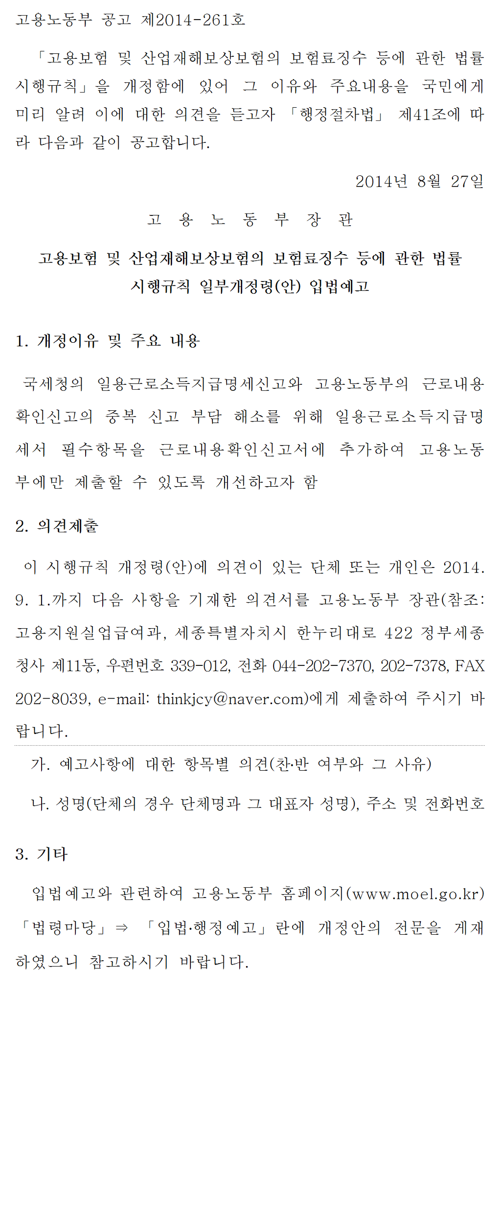 『고용보험법 시행규칙』및『고용보험 및 산업재해보상보험의 보험료징수 등에 관한 법률 시행규칙』 을 일부 개정함에 있어 그 취지와 주요 내용을 국민에게 미리 알려 이에 대한 의견을 듣고자 「행정절차법」 제41조에 따라 다음과 같이 공고합니다.