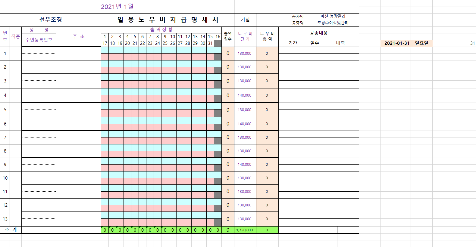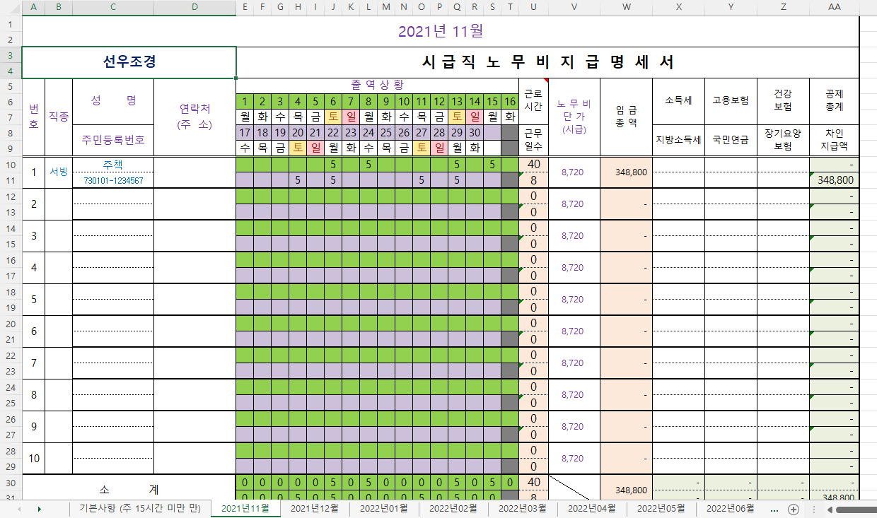 2021년 일용직대장 엑셀 간단 작성자주황규|작성시간21.01.12|조회수862 목록 댓글 0 글자크기 작게가 글자크기 크게가 2021년 01-12월 노무비 명세서(선우송부용).xlsx94.00KB2021년 11월 ~ 2022년 12월 시급대장(주15시간 미만 근무자만).xlsx155.30KB 첨부파일첨부된 파일이 11개 있습니다. jpg 파일 주황규.jpg 다운로드 xlsx 파일 2021년 01-12월 노무비 명세서(선우송부용).xlsx 다운로드 png 파일 일용직대장.png 다운로드 png 파일 일용근로자.png 다운로드 png 파일 일용근로소득.png 다운로드 png 파일 일용근로자.png 다운로드 png 파일 건설업 일용근로자.png 다운로드 png 파일 일용근로자 연말정산.png 다운로드 png 파일 건설현장 일용직.png 다운로드 xlsx 파일 2021년 11월 ~ 2022년 12월 시급대장(주15시간 미만 근무자만).xlsx 다운로드 png 파일 일용직대장.png 다운로드 다음검색 현재 게시글 추가 기능 열기 북마크 공유하기 신고 센터로 신고 댓글 댓글 0 댓글쓰기 답글쓰기 댓글 리스트