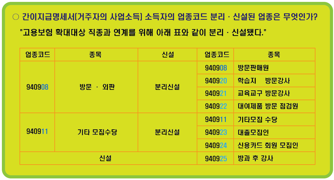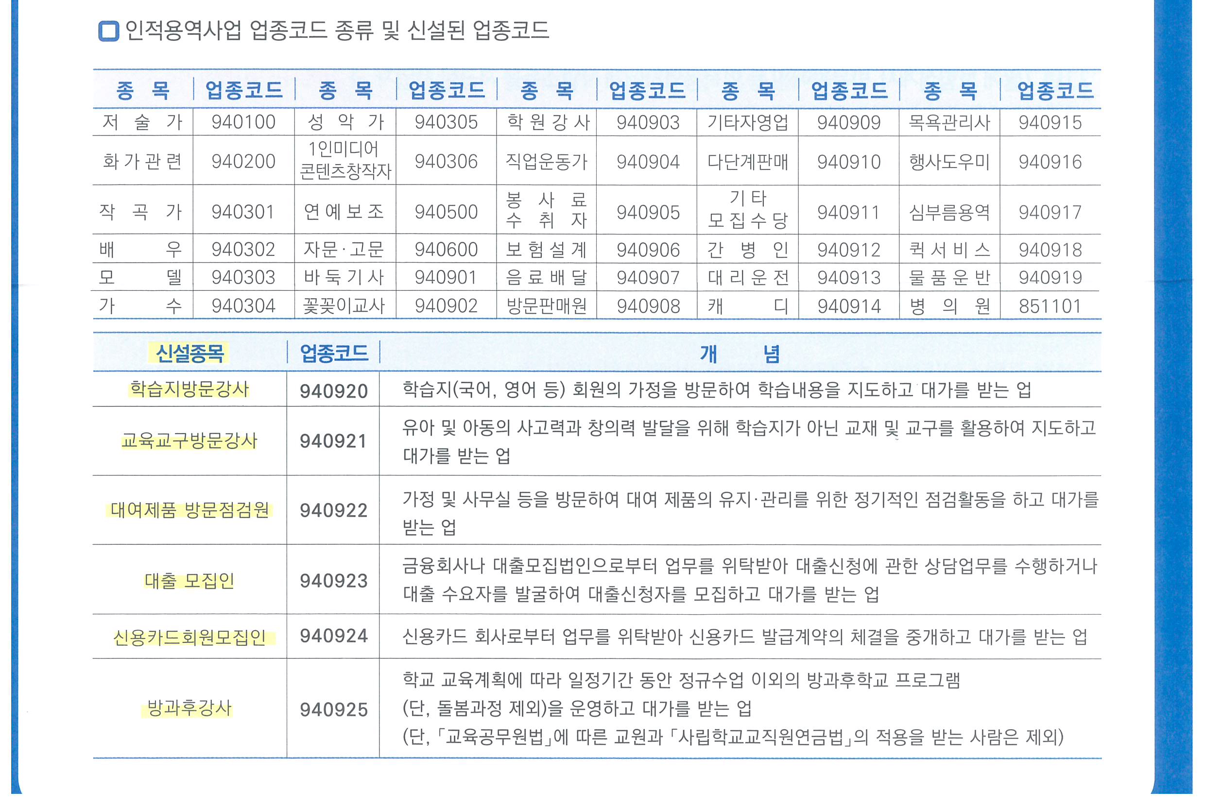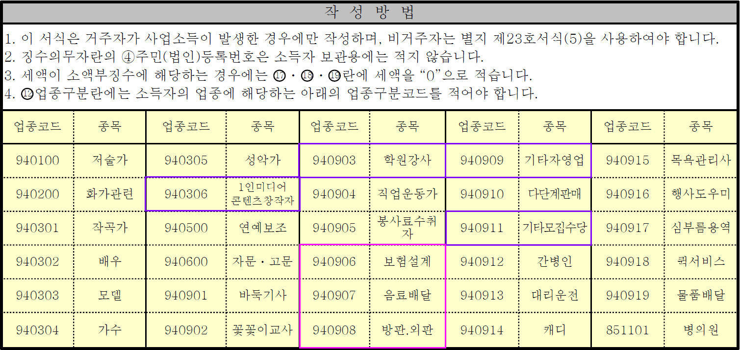 · 기타자영업 코드(940909)는 고용관계 없이 독립된 자격으로 일정한 고정보수를 받지 않고 그 실적에 따라 수당 또는 이와 유사한 성질의 대가를 지급받는 경우로서 위 표에서 기타자영업을 제외한 35개 업종코드 중 어느 하나로 분류되지 않는 업종(예: 컴퓨터 프로그래머, 전기·가스검침원 등)인 경우 적습니다.