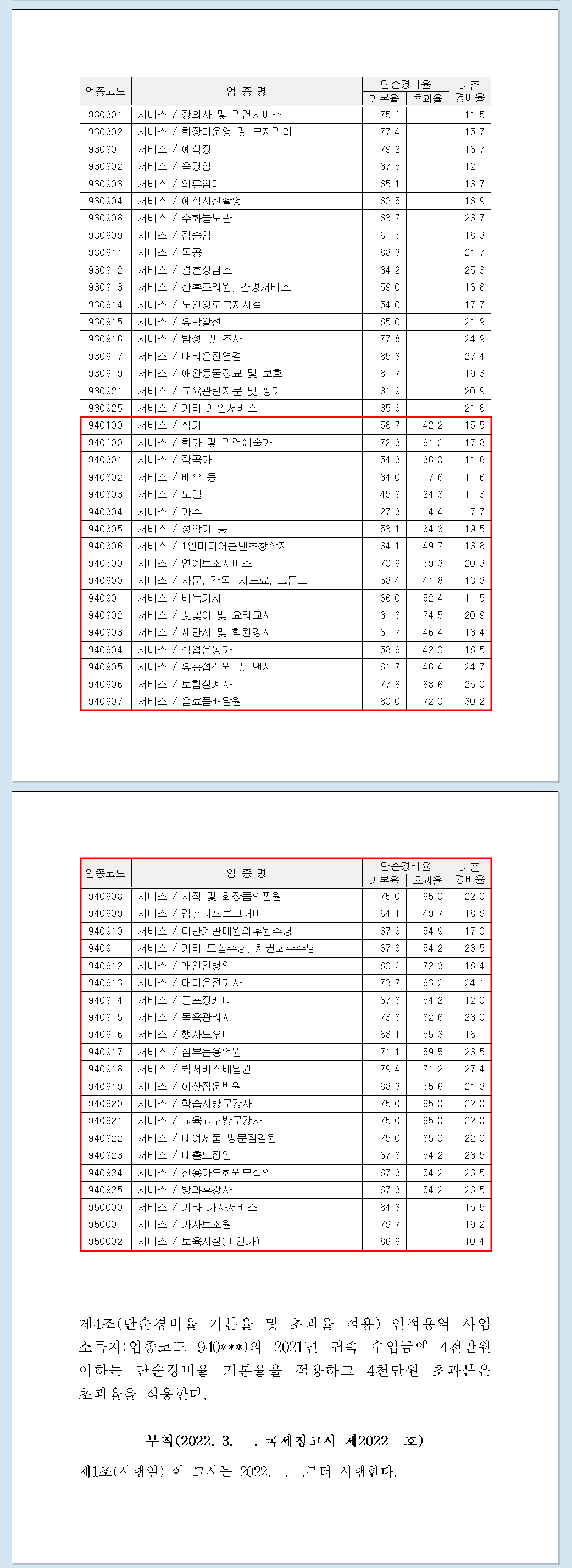 제4조(단순경비율 기본율 및 초과율 적용) 인적용역 사업소득자(업종코드 940***)의 2021년 귀속 수입금액 4천만원 이하는 단순경비율 기본율을 적용하고 4천만원 초과분은 초과율을 적용한다.