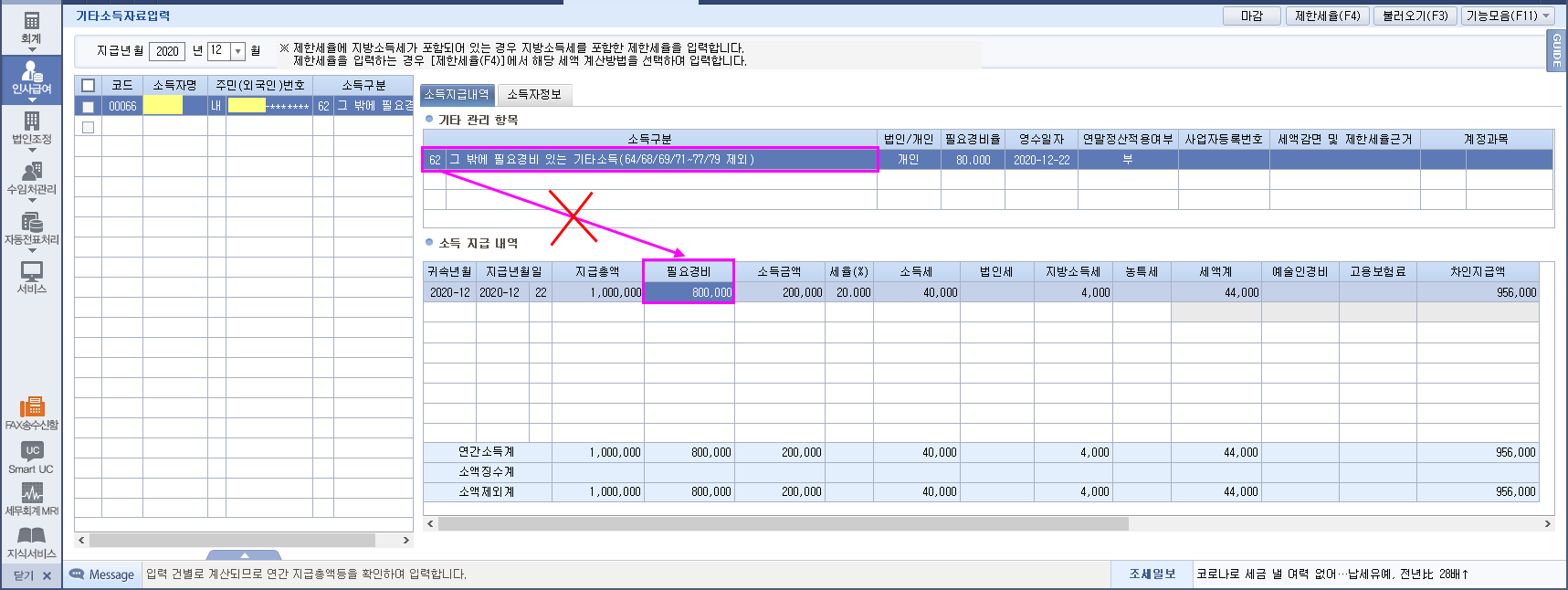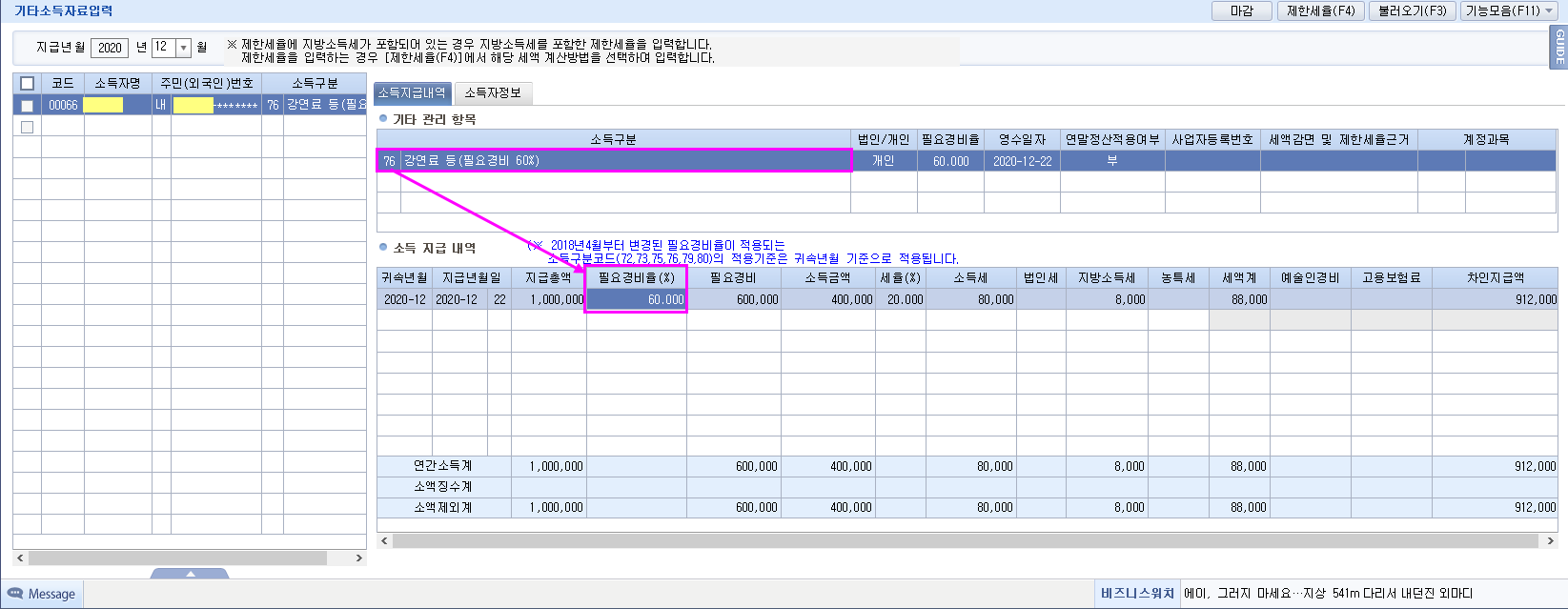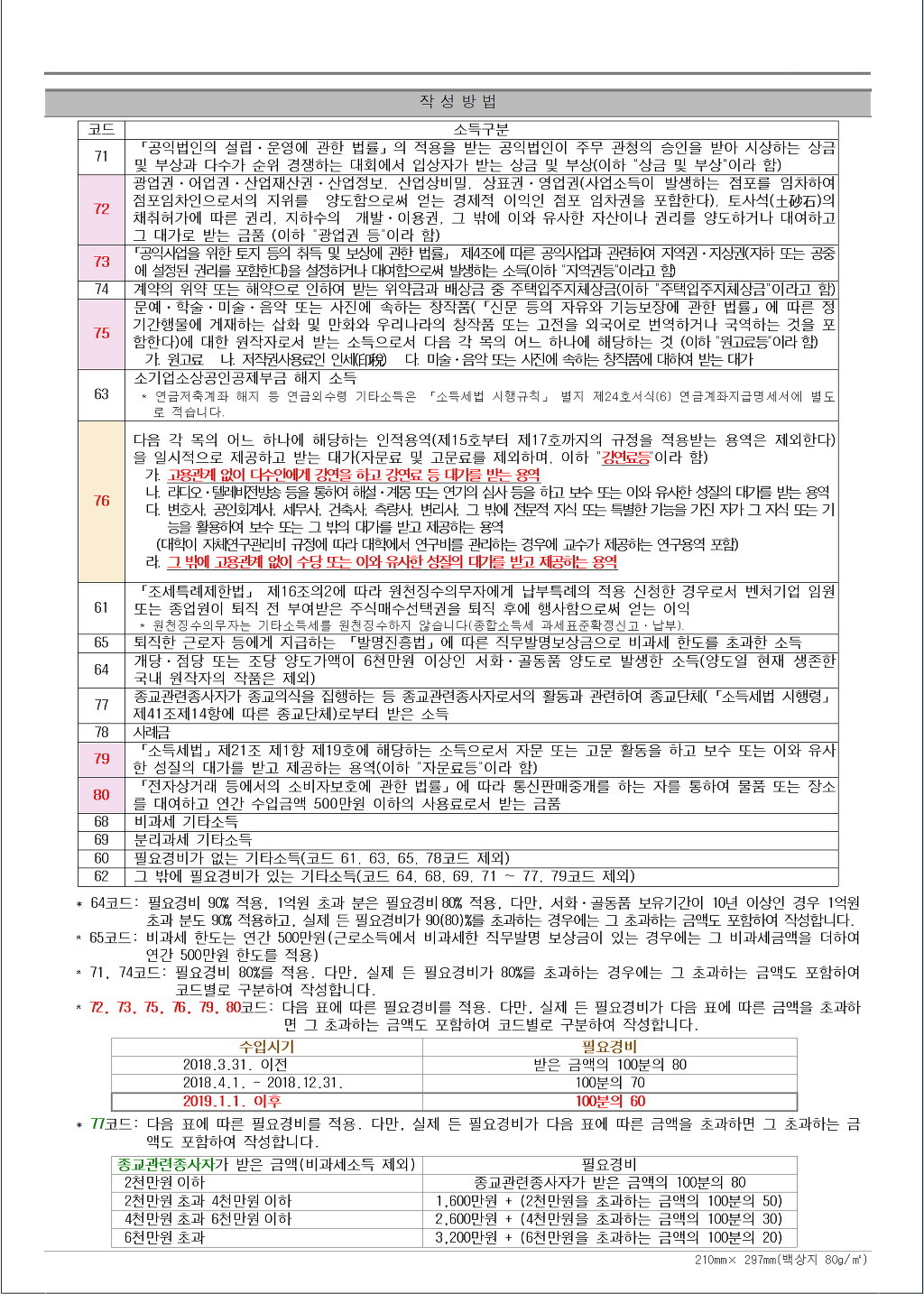기타소득 - 62 : 그 밖에 필요경비 있는 기타소득은 필요경비 80% 선택하지 말것/76.강연료등필요경비60%(직접법8.8%)선택