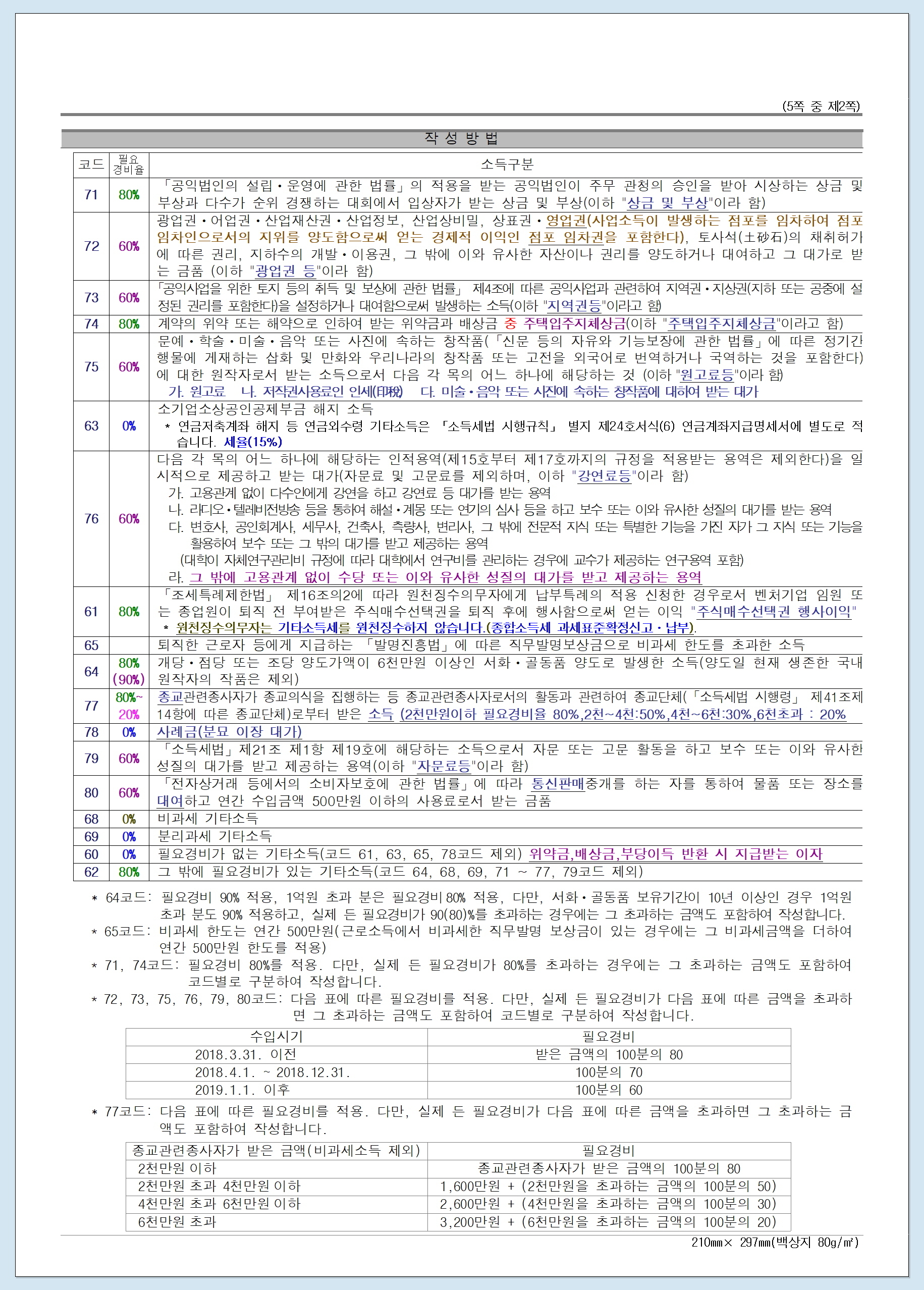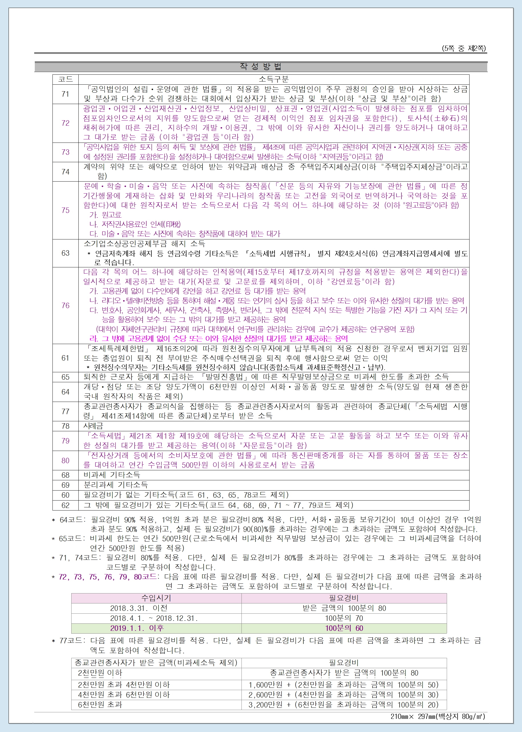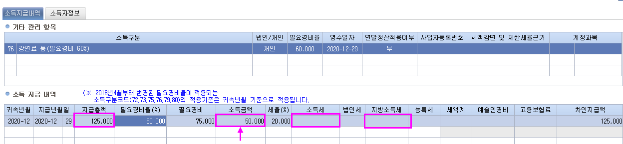 필요경비 60% 코드 (기타소득 과세최저한 소득금액 : 5만원 , 지급금액(60% 필요경비율 코드인 경우) : 125,000원)