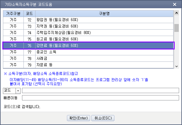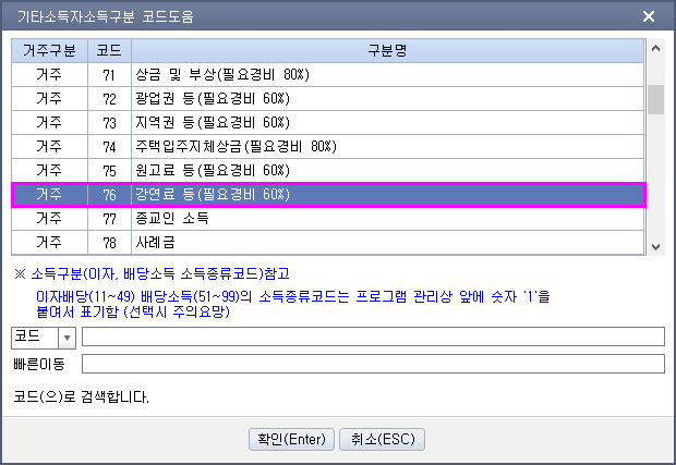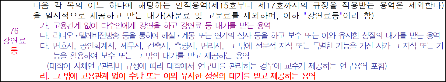 76 : 강연료 등 (필요경비 60%) : 그 밖에 고용관계없이 수당 또는 이와 유사한 성질의 대가를 받고 제공하는 용역