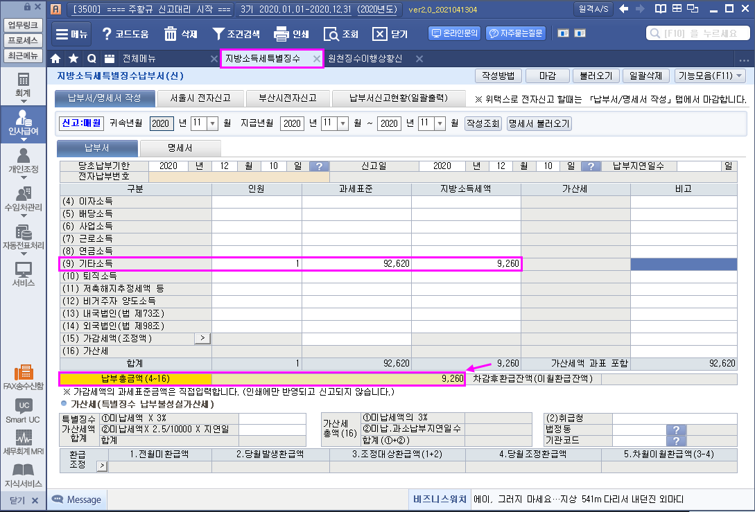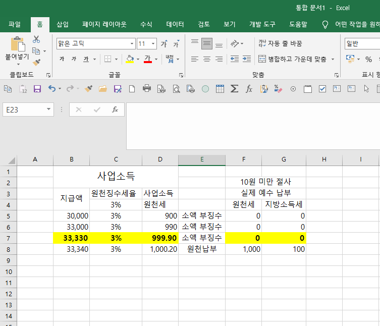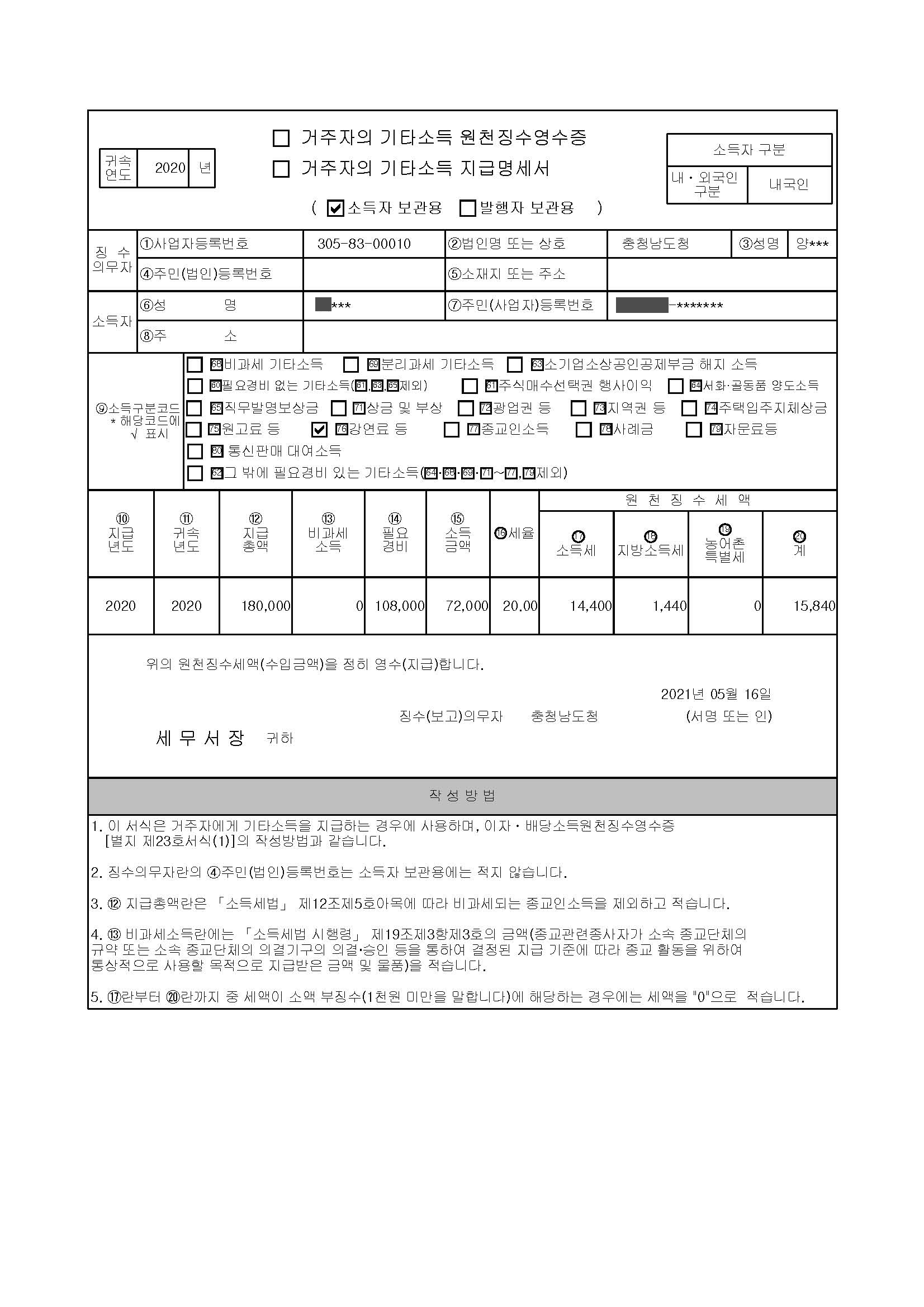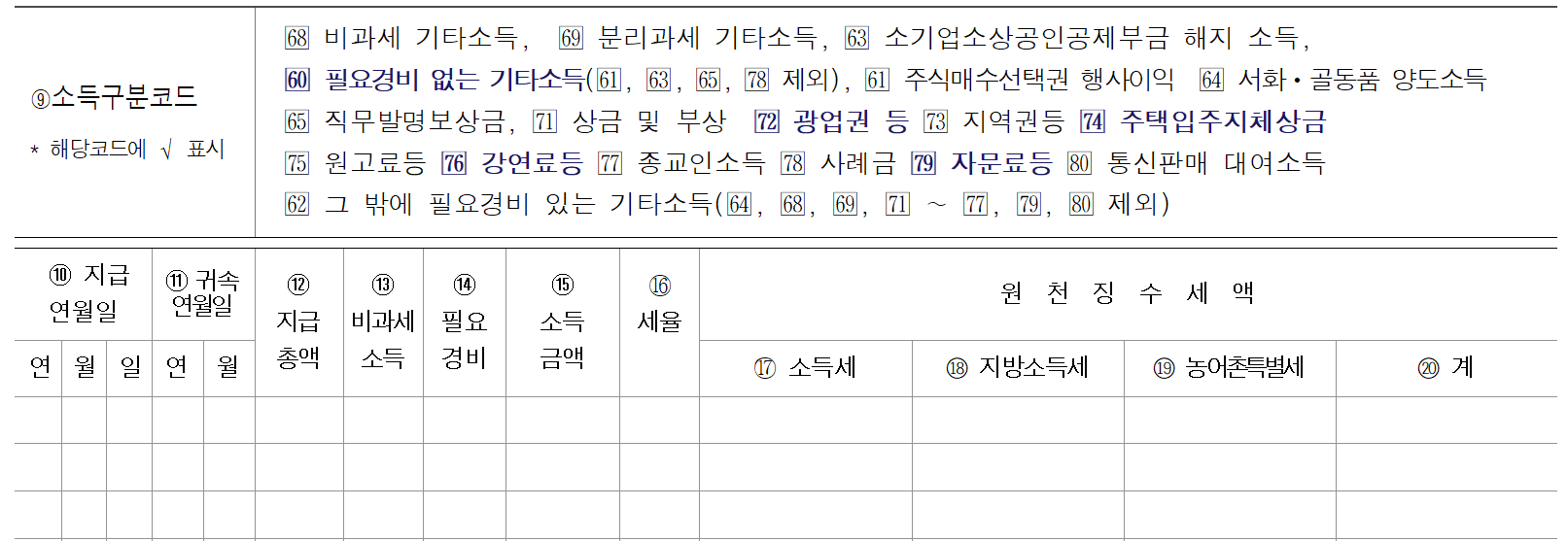 하단은 사업소득 (지급액의 3.3% 원천징수)