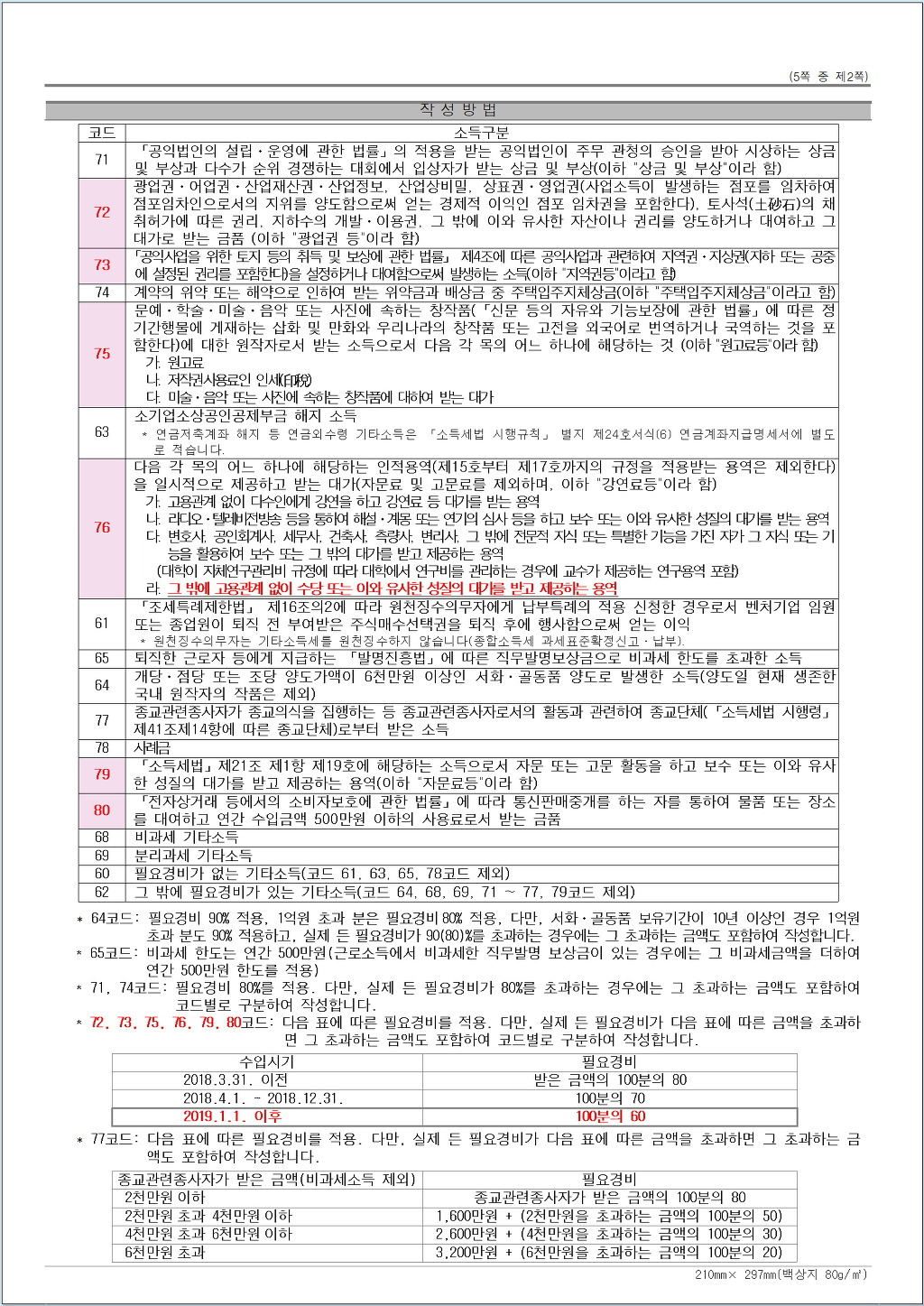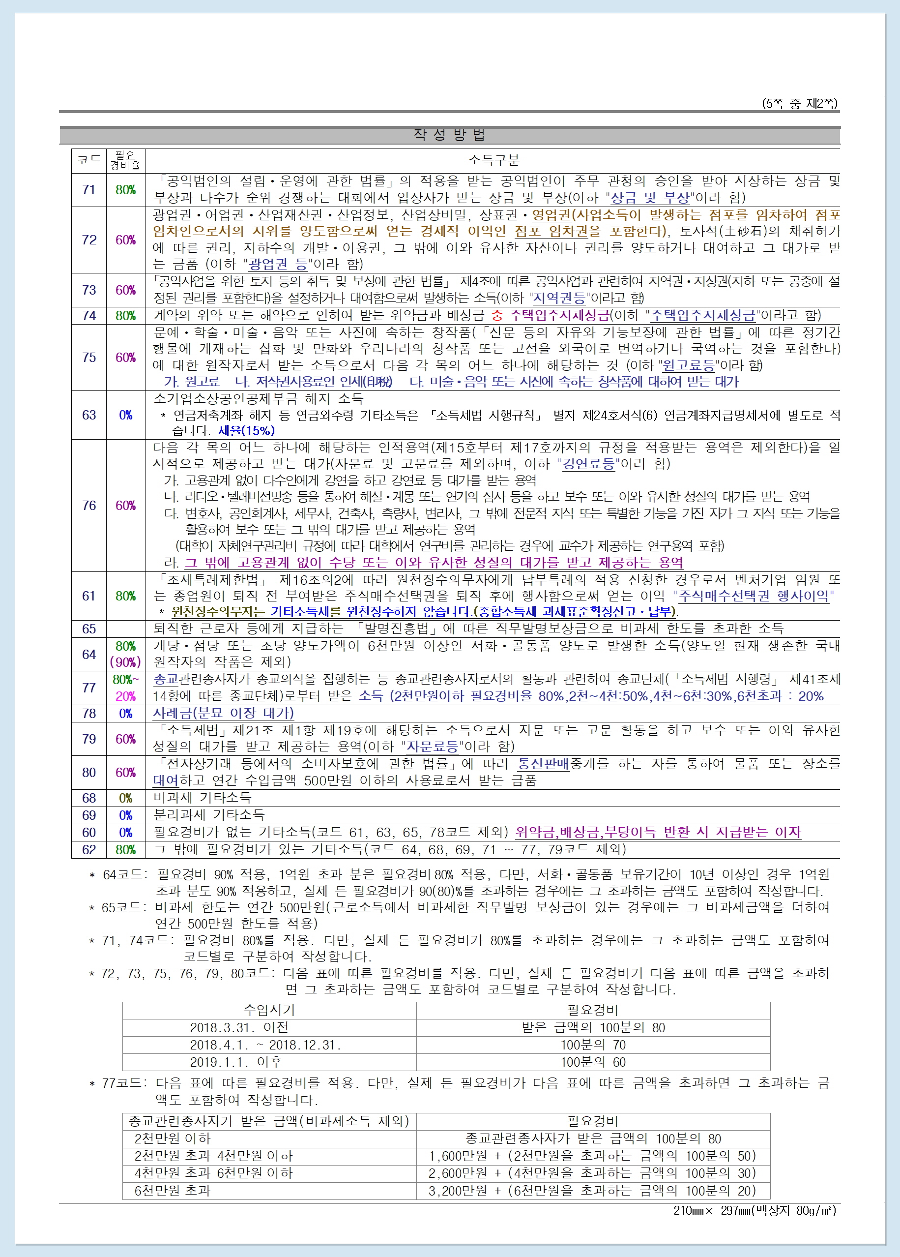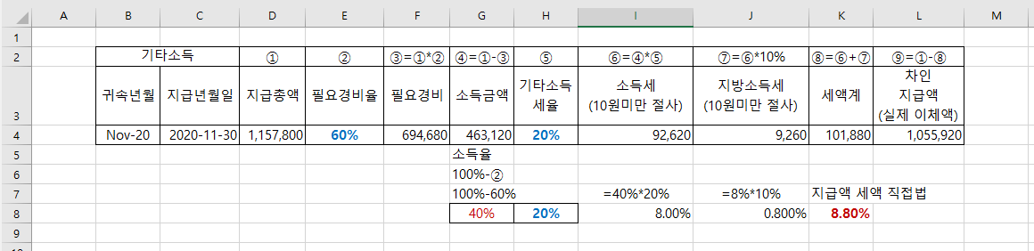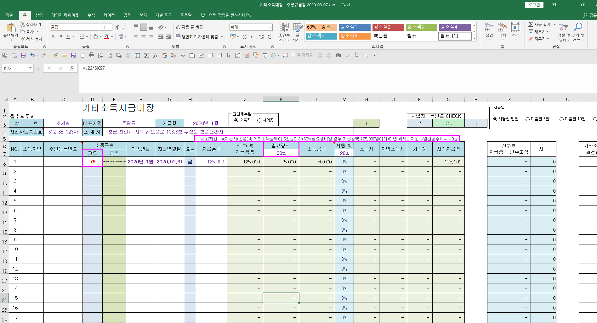 엑셀 기타소득대장 2019.01.01일 이후 기타소득(지급액 직접법으로 8.8% 원천징수) 필요경비율 60% -> 76 강연료